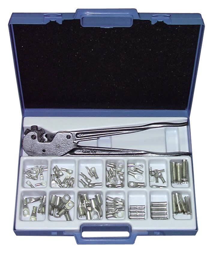 Pince à sertir mécanique manuelle à barillet (6-70mm²) Unilec en coffret plastique + assortiment de cosses XCT 6-6, 10-6, 10-8 (x10) et XCT 16-6, 16-8, 25-8, 25-10, 35-8, 50-10, 70-10 (x5) ainsi que manchons XG7T 16-25-50-70mm² (x5)