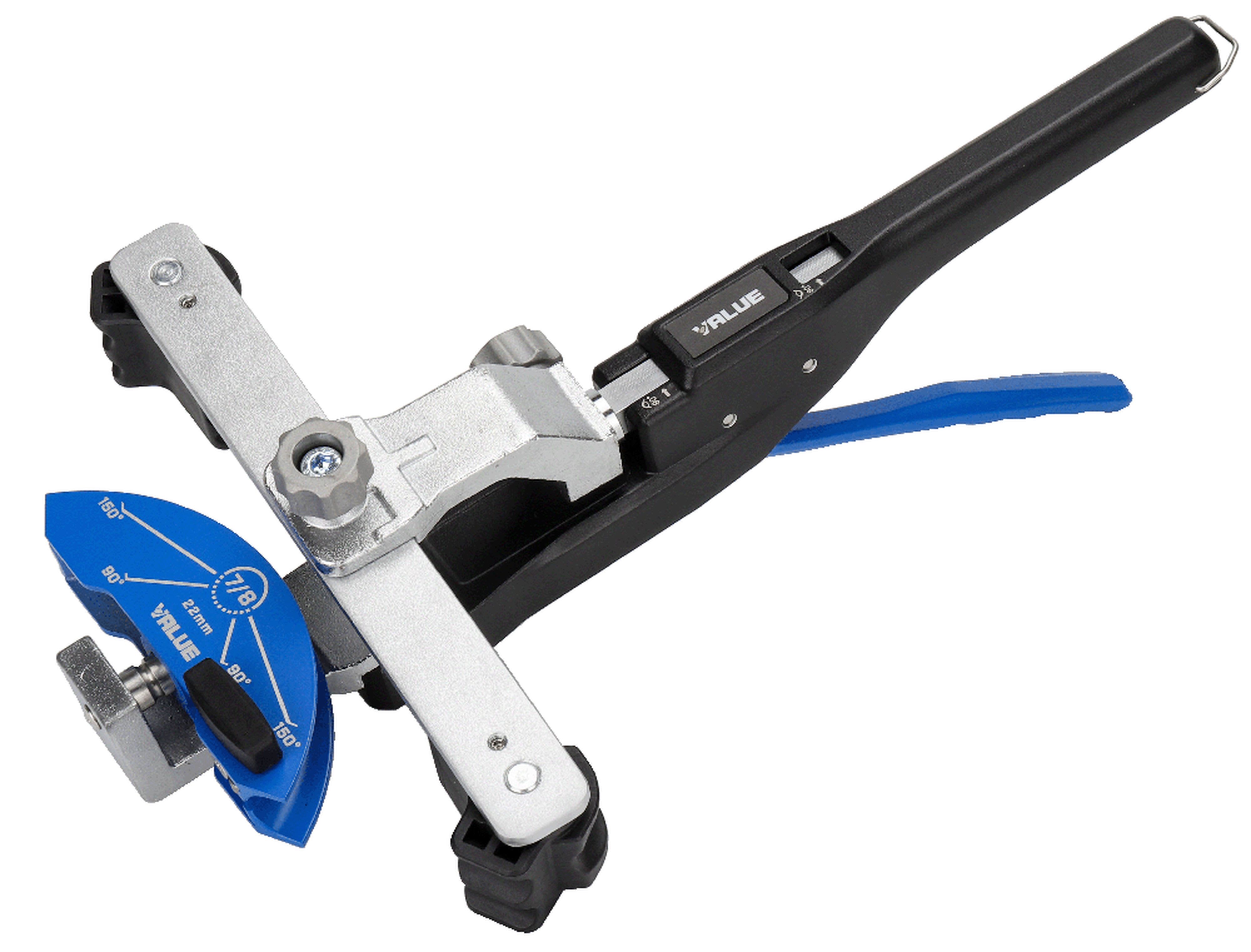Cintreuse arbalète ergonomique et professionnelle avec indicateur d’angle de cintrage à 90°, pour une précision de travail parfaite. Moins de pièces et installation plus rapide : 2 galets rotatifs et une tête de cintrage seulement. - Un seul outil pour les tubes en pouce et en millimètre. - Relâchement facile et rapide du tube cintré en une seule pression. - Fourni avec le kit de cintrage inverse pour un travail précis et rapide. Convient pour tubes : 1/4", 5/16", 3/8", 1/2", 5/8", 3/4", 7/8", et 6, 8, 10, 12, 16, 19 et 22 mm