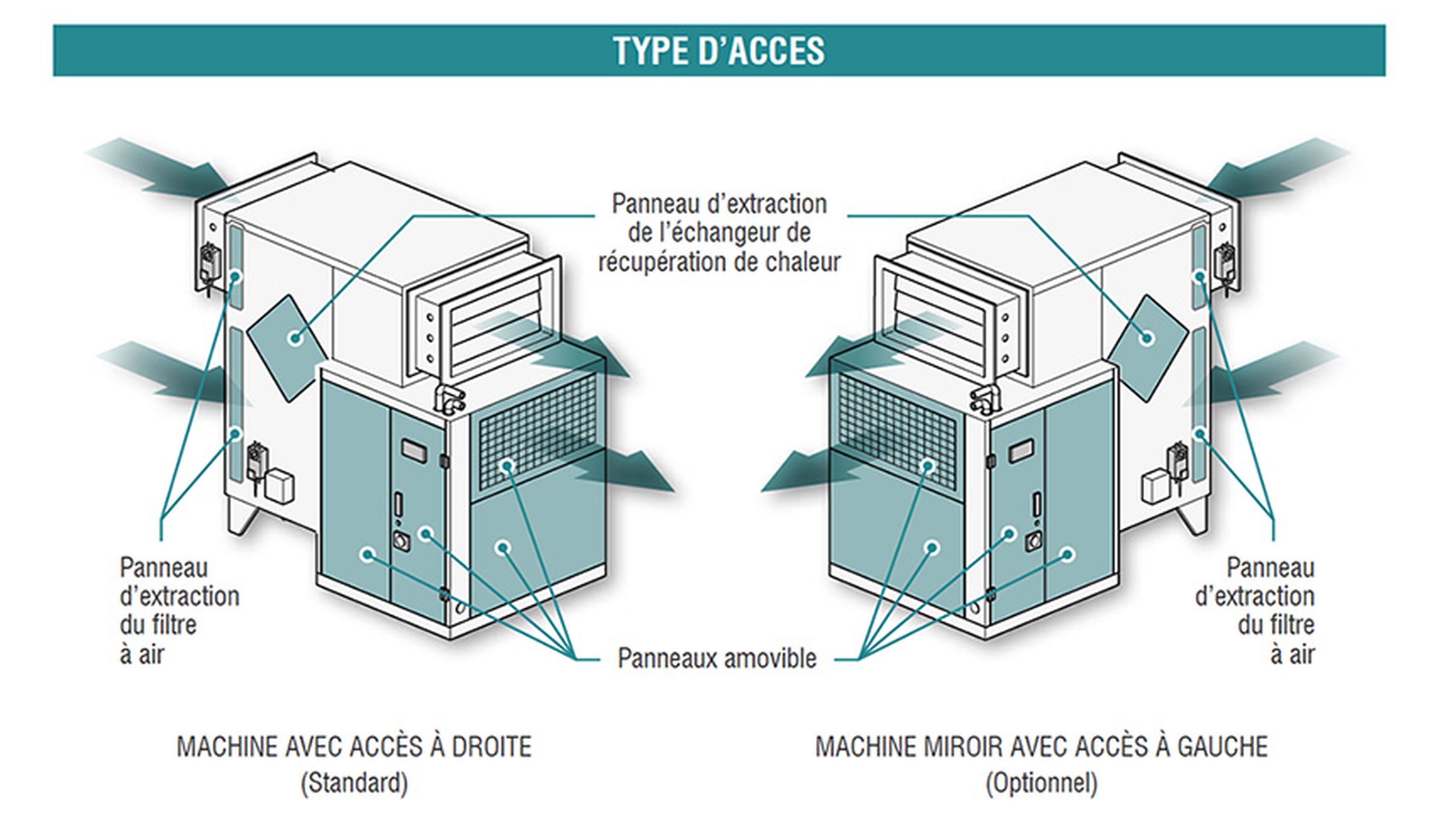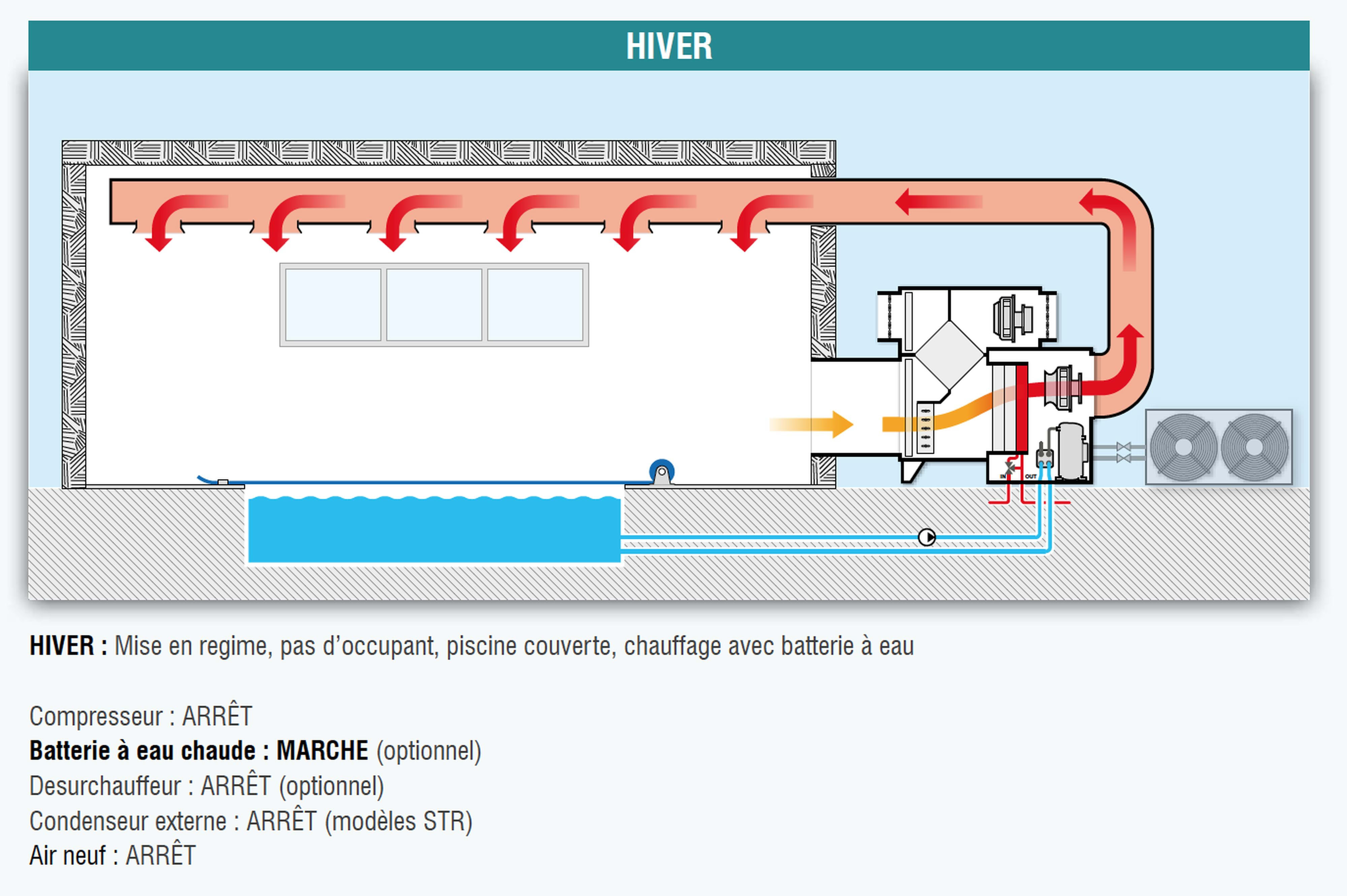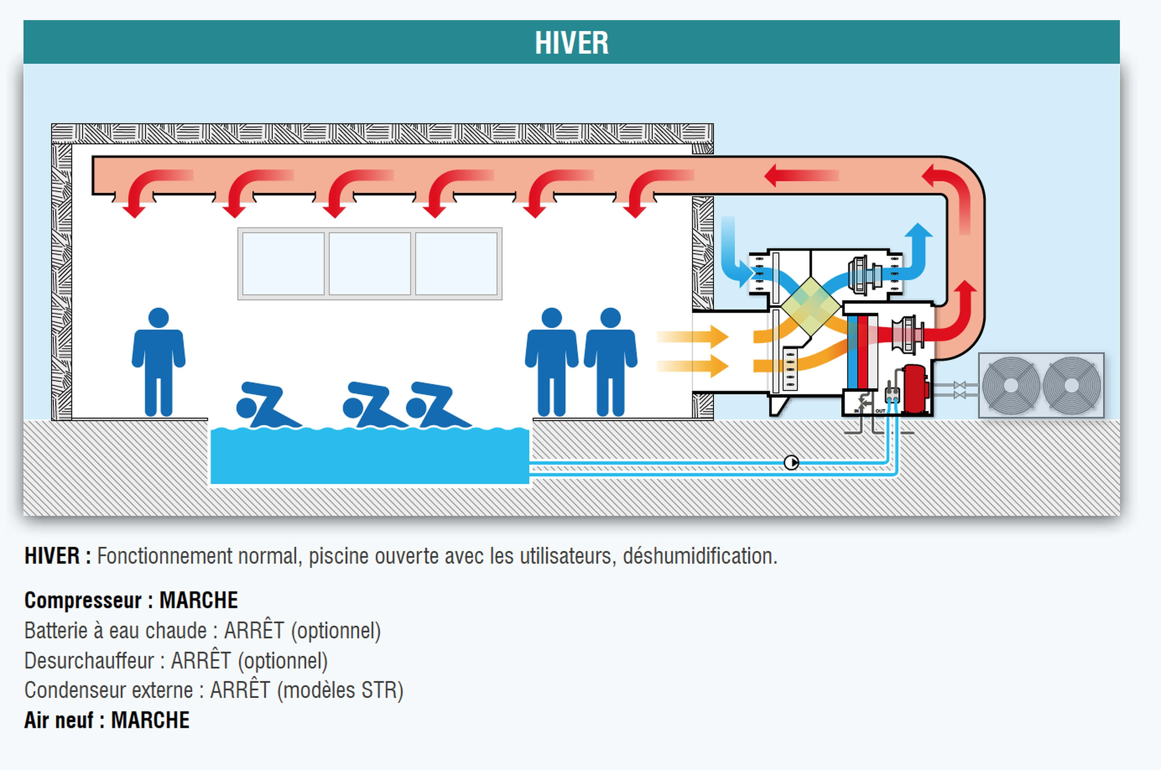 Déshumidificateur double flux, conçu pour la déshumidification, le chauffage, le freecooling et le renouvellement d’air avec récupération de chaleur des piscines intérieures.