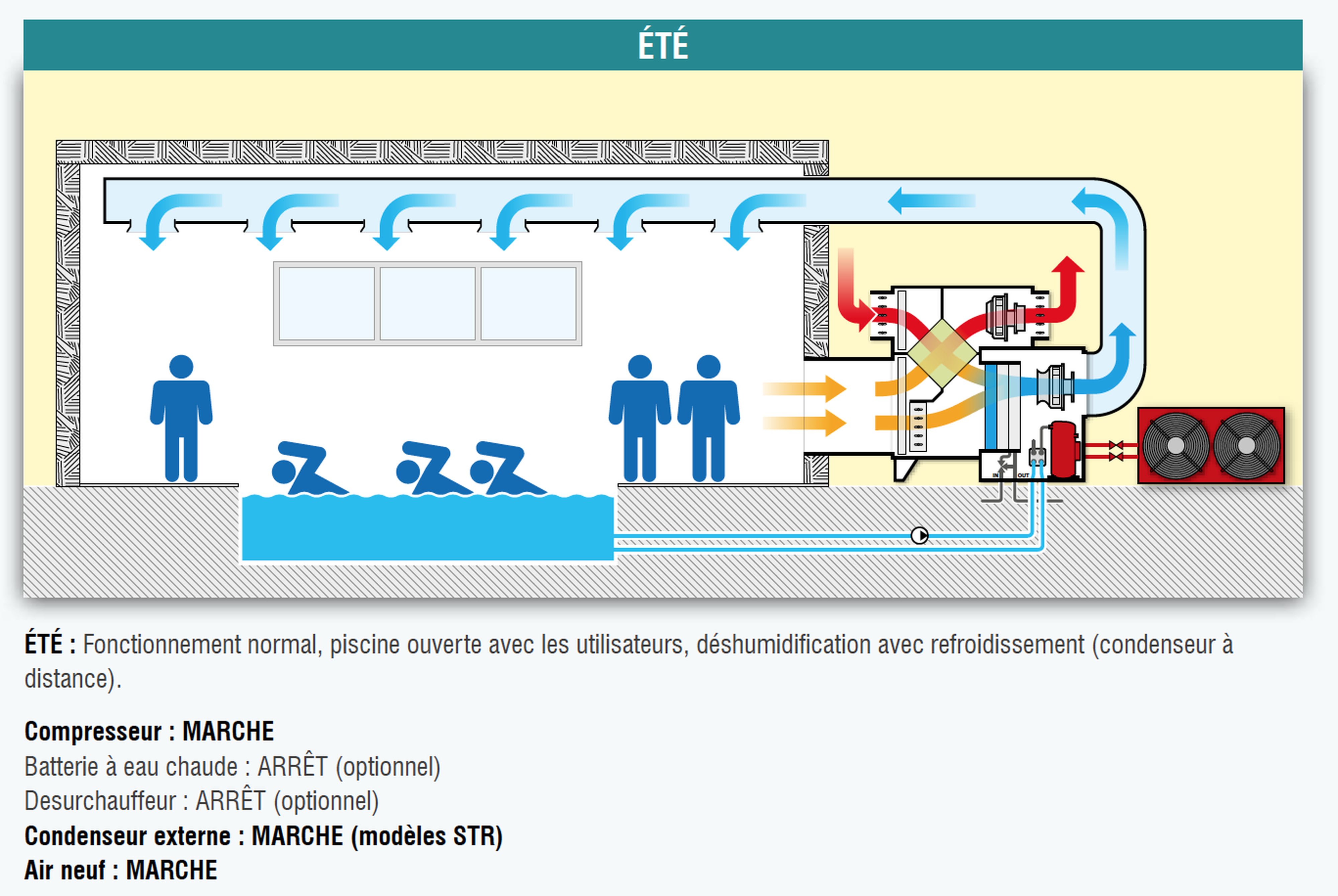 Déshumidificateur double flux, conçu pour la déshumidification, le chauffage, le freecooling et le renouvellement d’air avec récupération de chaleur des piscines intérieures.