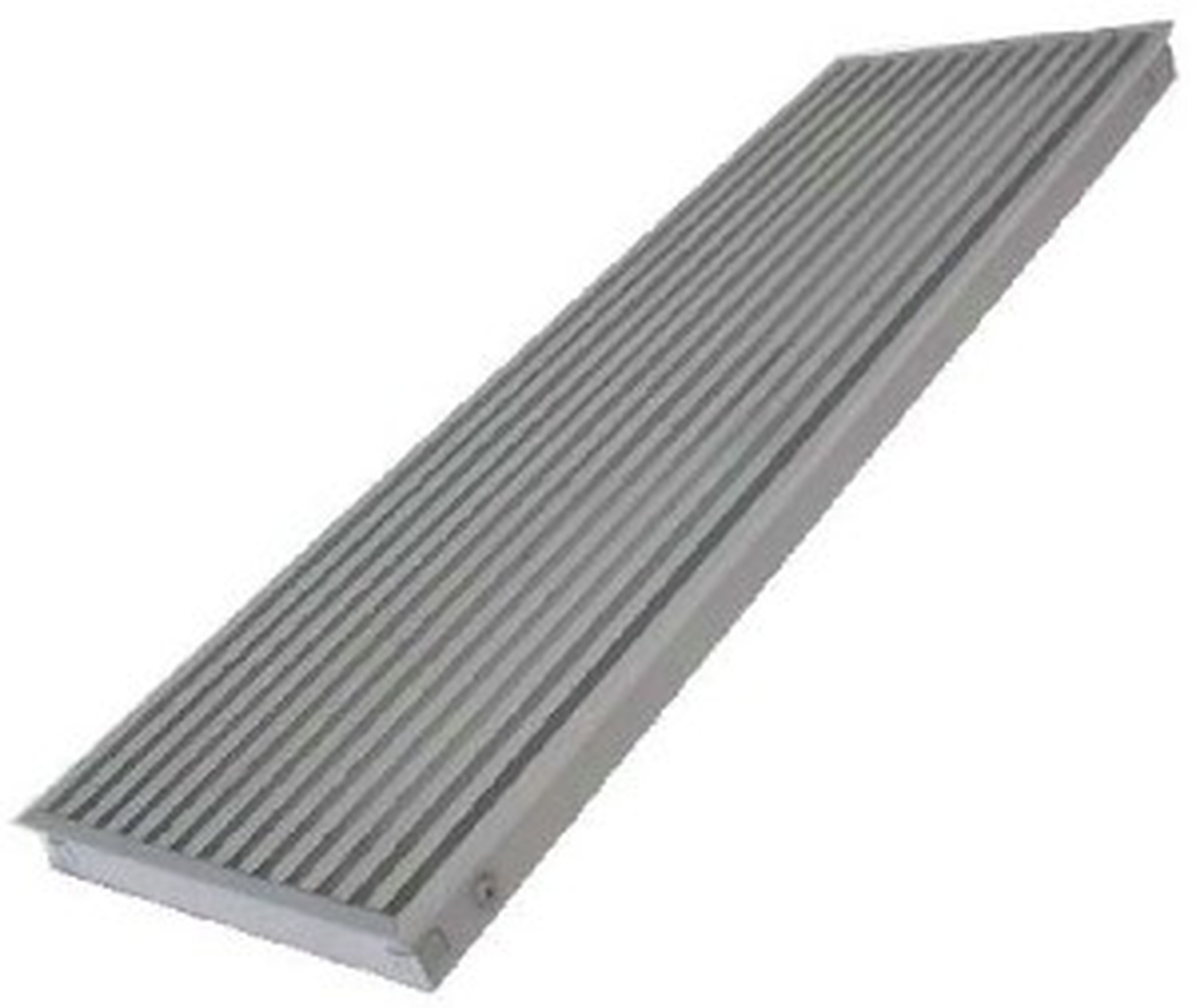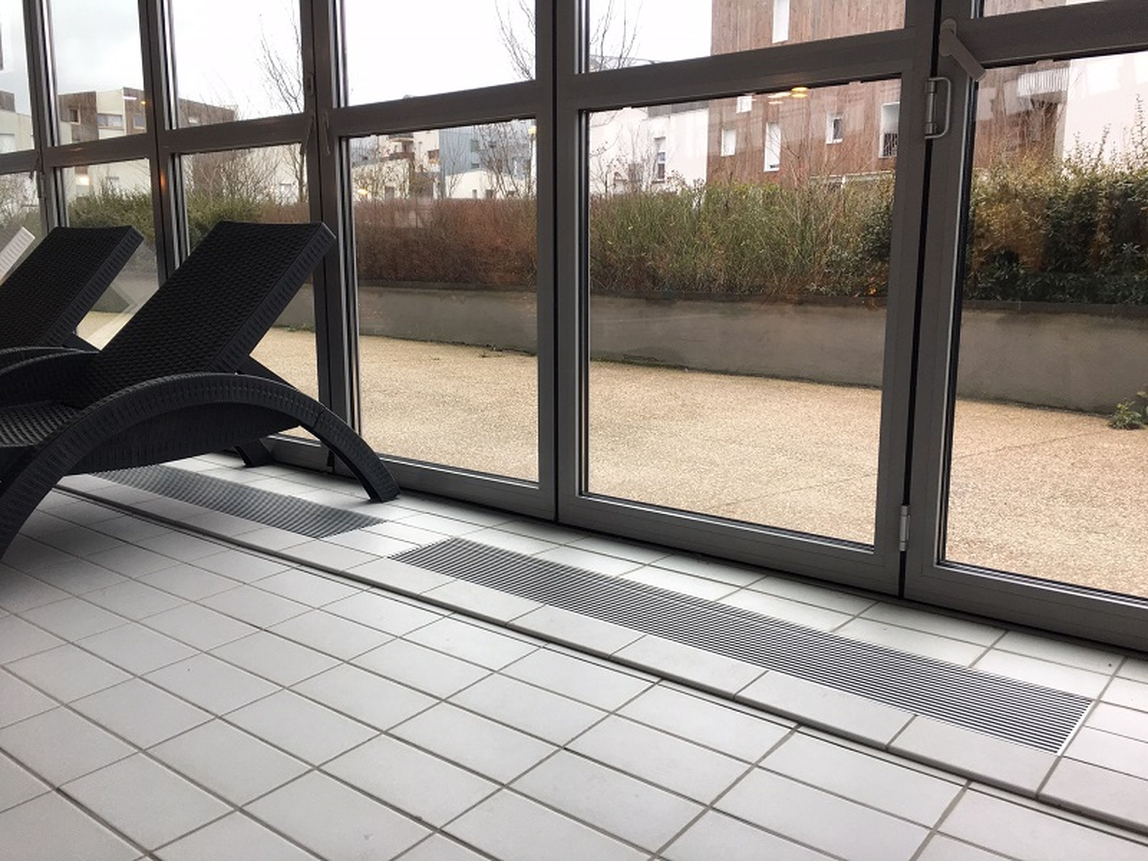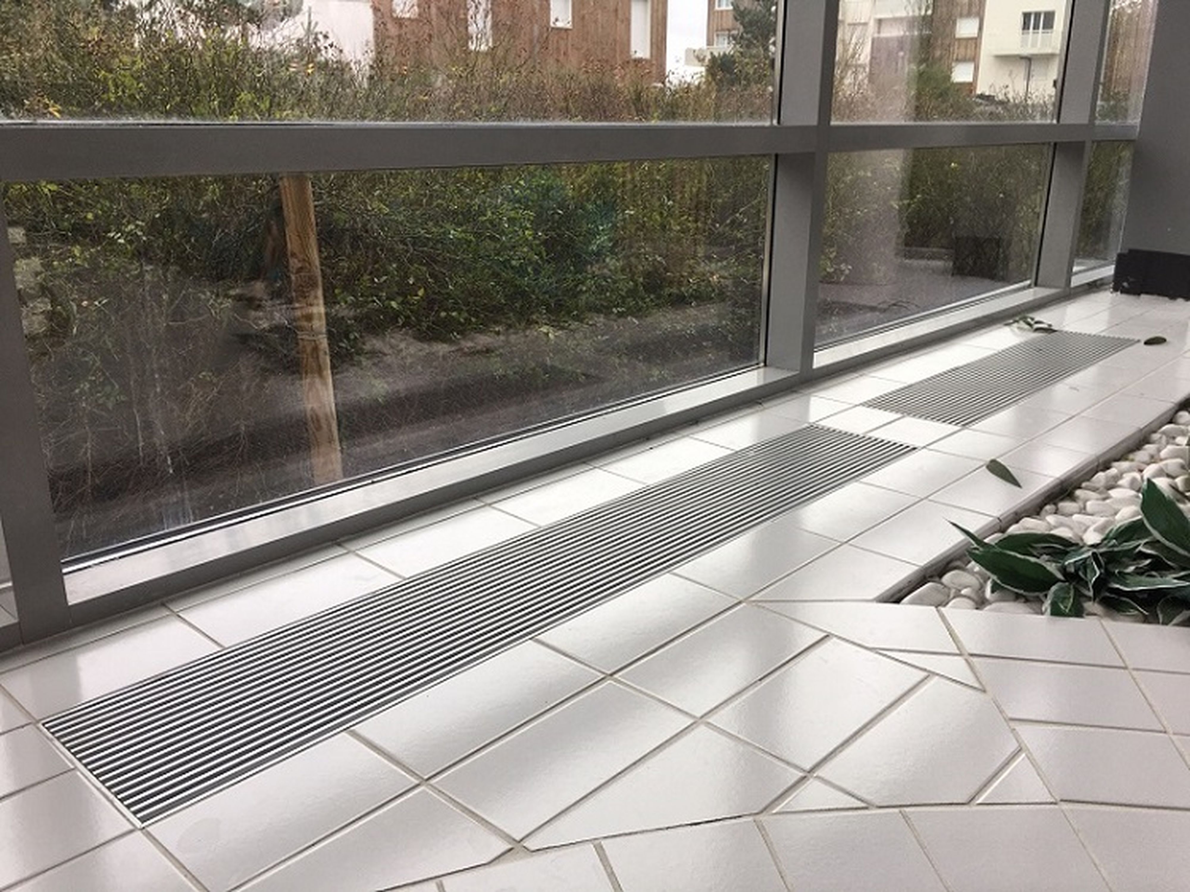 Grille de sol linéaire, pour le soufflage ou la reprise de l'air de la piscine, a ailettes fixes paralleles inclinées de 15°.