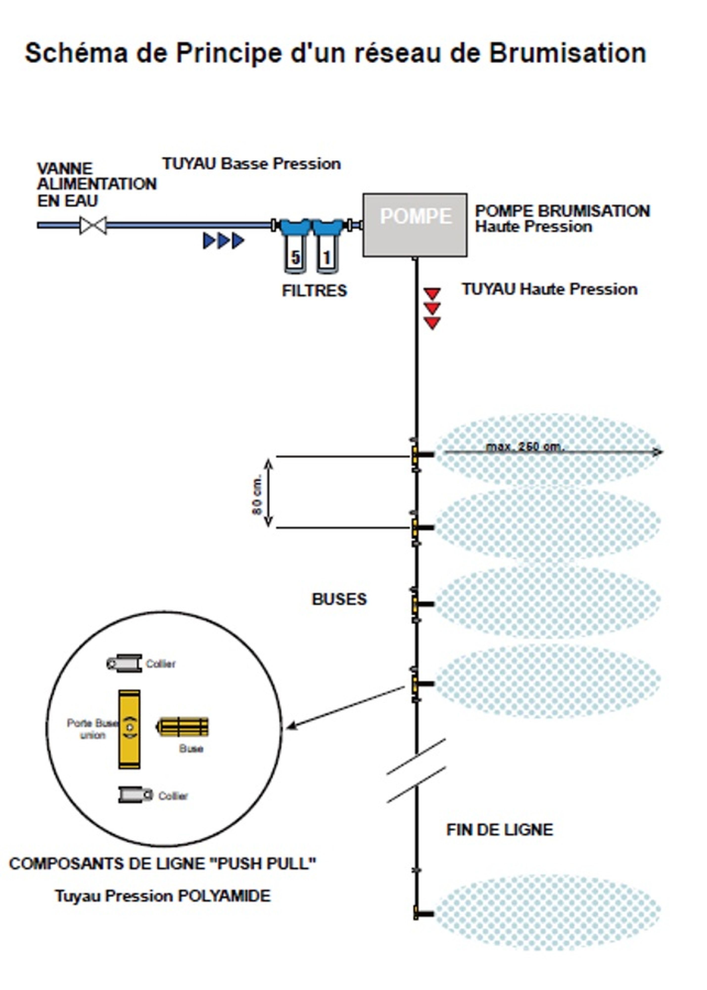 La pompe à haute pression du kit Premium TEDDINGTON pulvérise l’eau à 70 bars, et génere une brume tres fine.