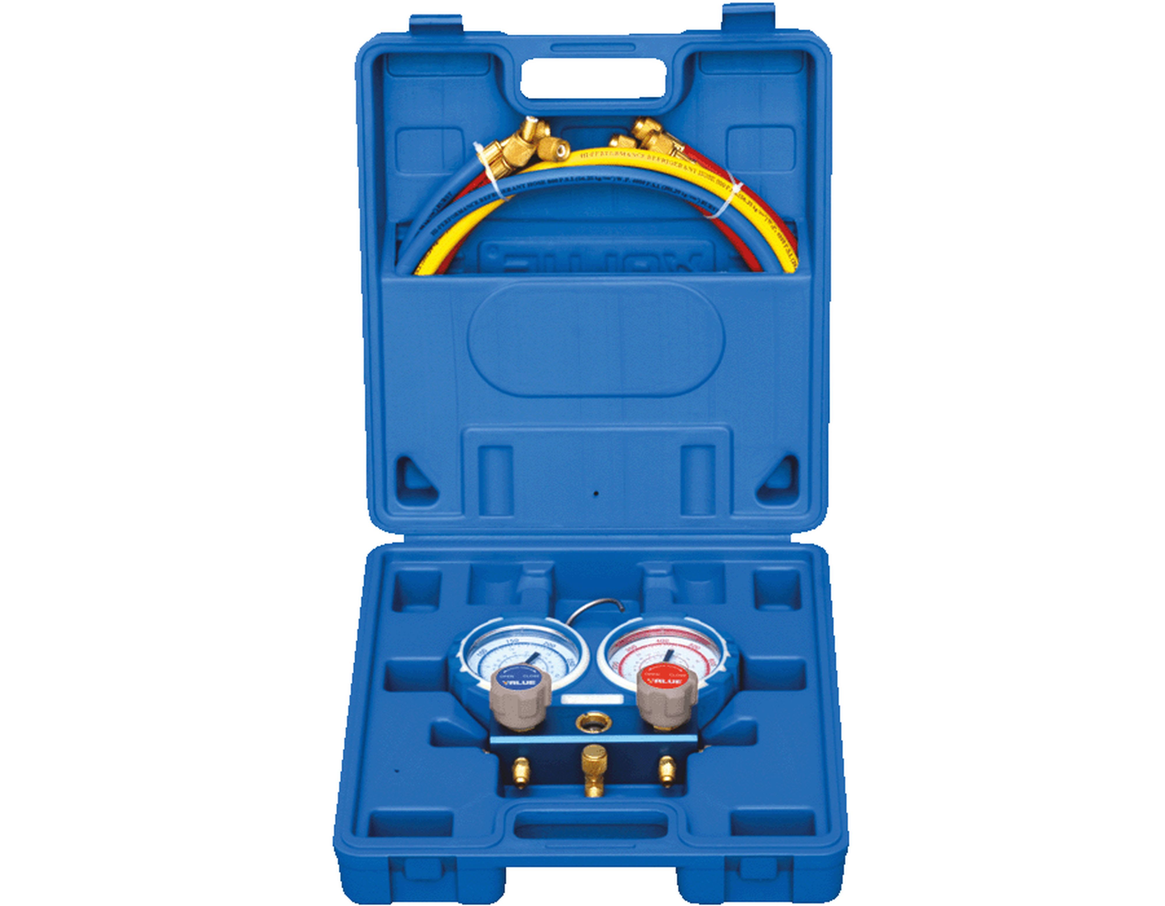Manomètre 2 voies en coffret (R22, R134a, R404A & R407C) avec 3 flexibles 1,5 m - VALUE