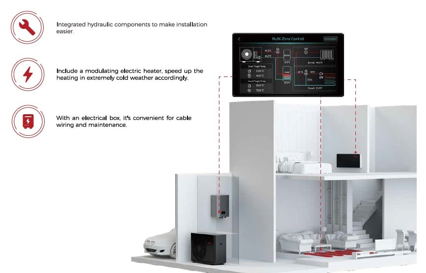 Le module hydraulique avec résistance d'appoint permet de compléter et de sécuriser l'installation de la pompe à chaleur ORIGIN. Le module hydraulique ORIGIN-MH3M est spécialement conçu pour améliorer la flexibilité des installations et réduire les coûts d'installation. Avec ce module, l'installateur professionnel peut prendre moins de travail pour l'installation de la pompe à chaleur dans votre maison.