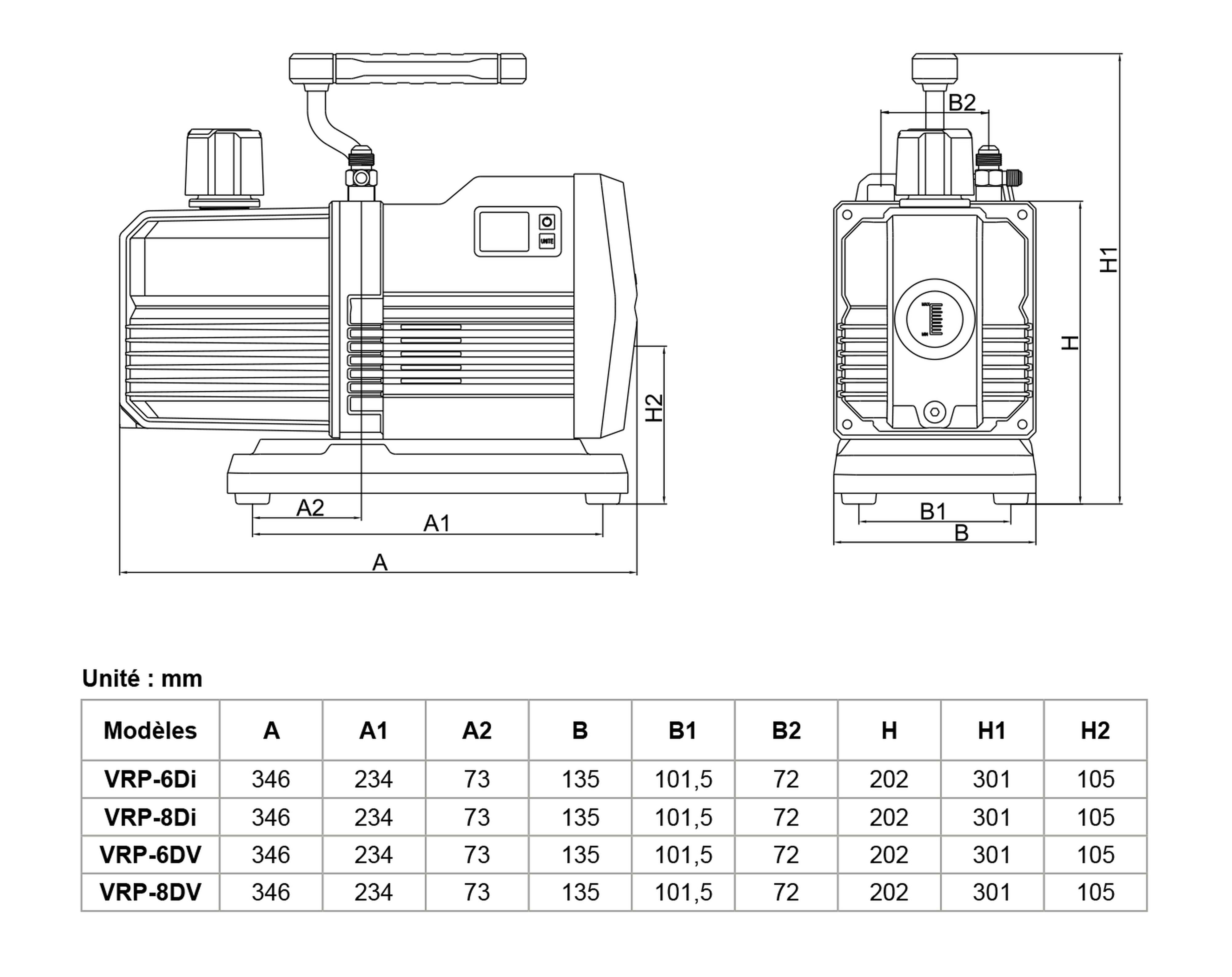 La pompe a vide VALUE TF-VRP 8Di est une pompe a vide a deux étages compatible avec le R32 ainsi que les réfrigérants R1234yf, R410A, R134a, R22 etc.