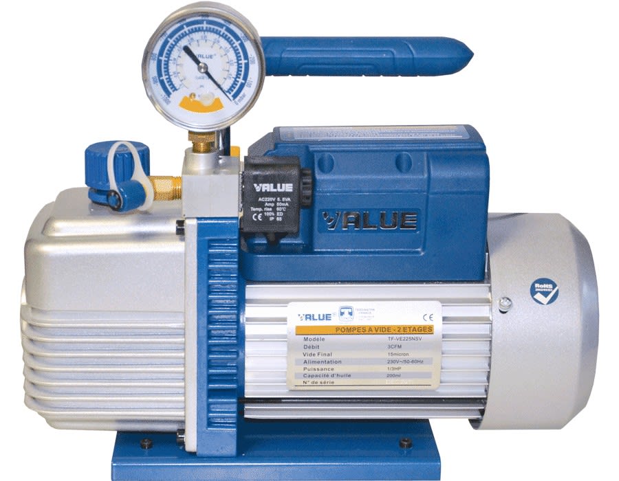 La pompe a vide VALUE TF-VE2100N SV est une pompe a vide deux étages compatible pour CFC, HCFC.
