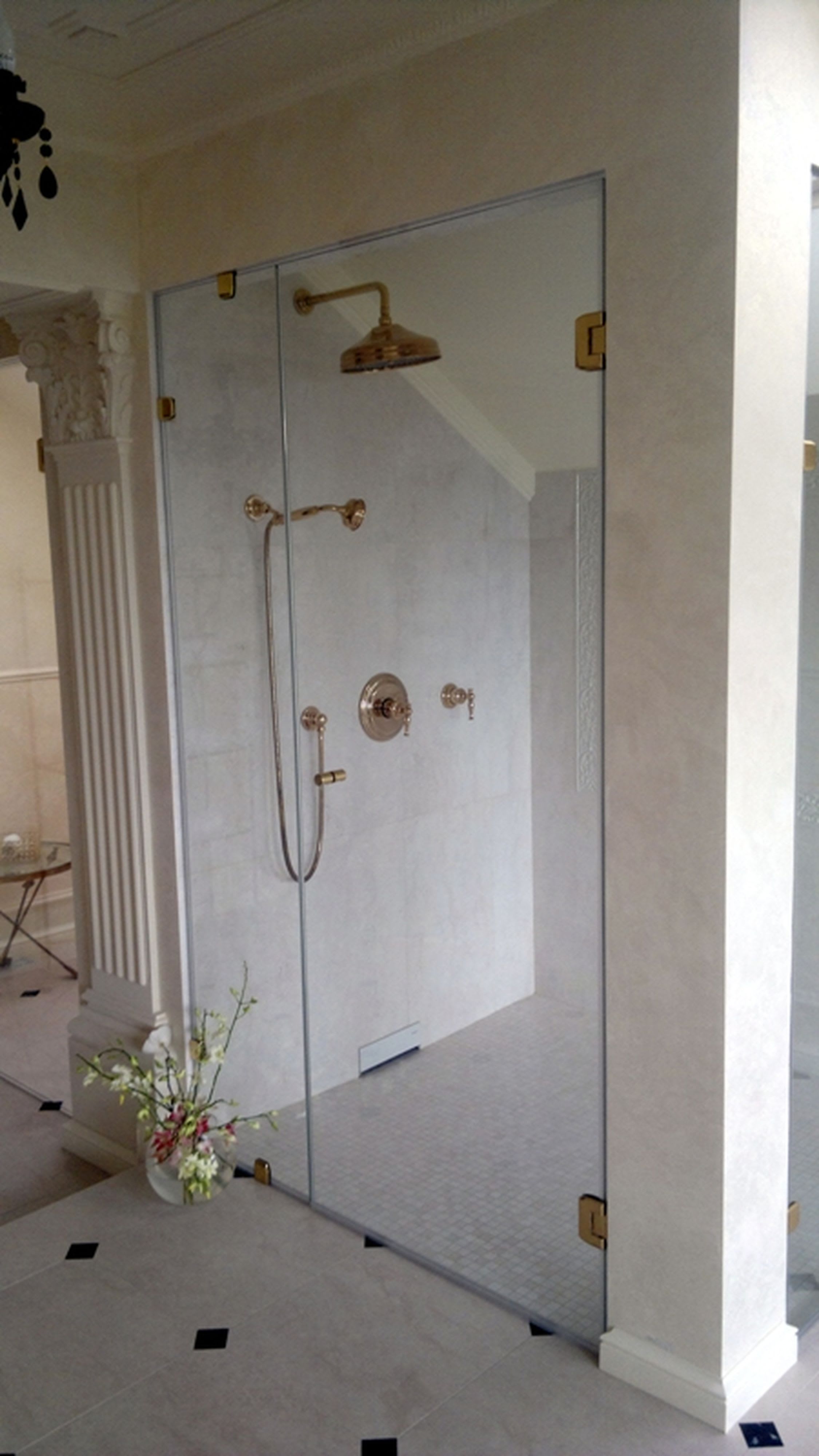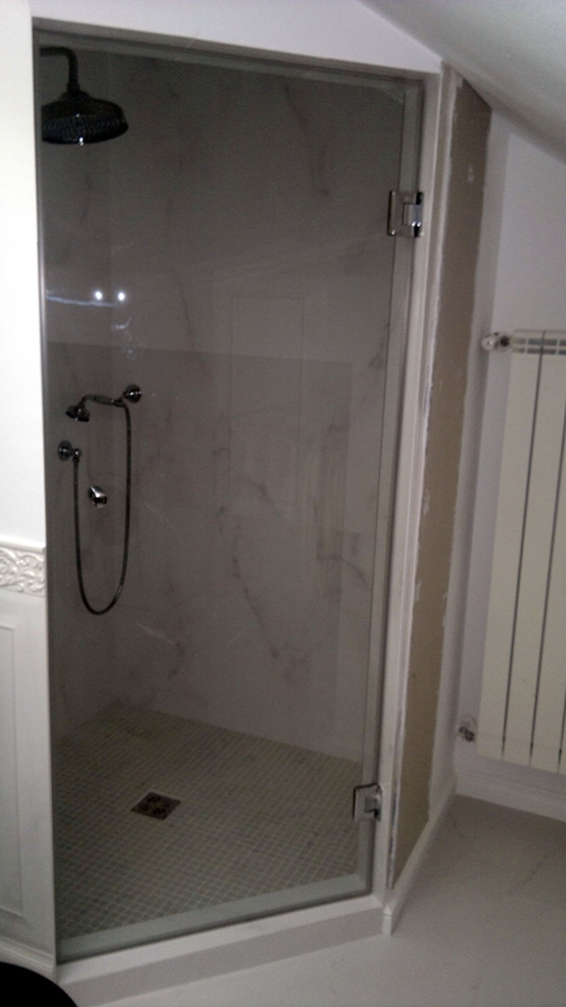 La porte pour hammam sans bâti consiste en une paroi de verre surmontée d’un léger joint périmétrique sur 3 côtés.