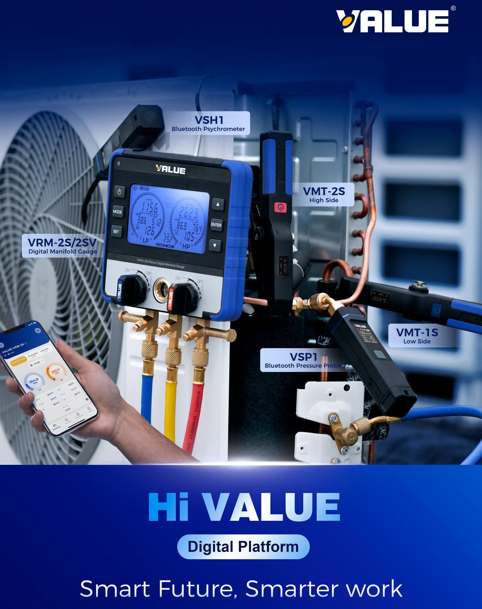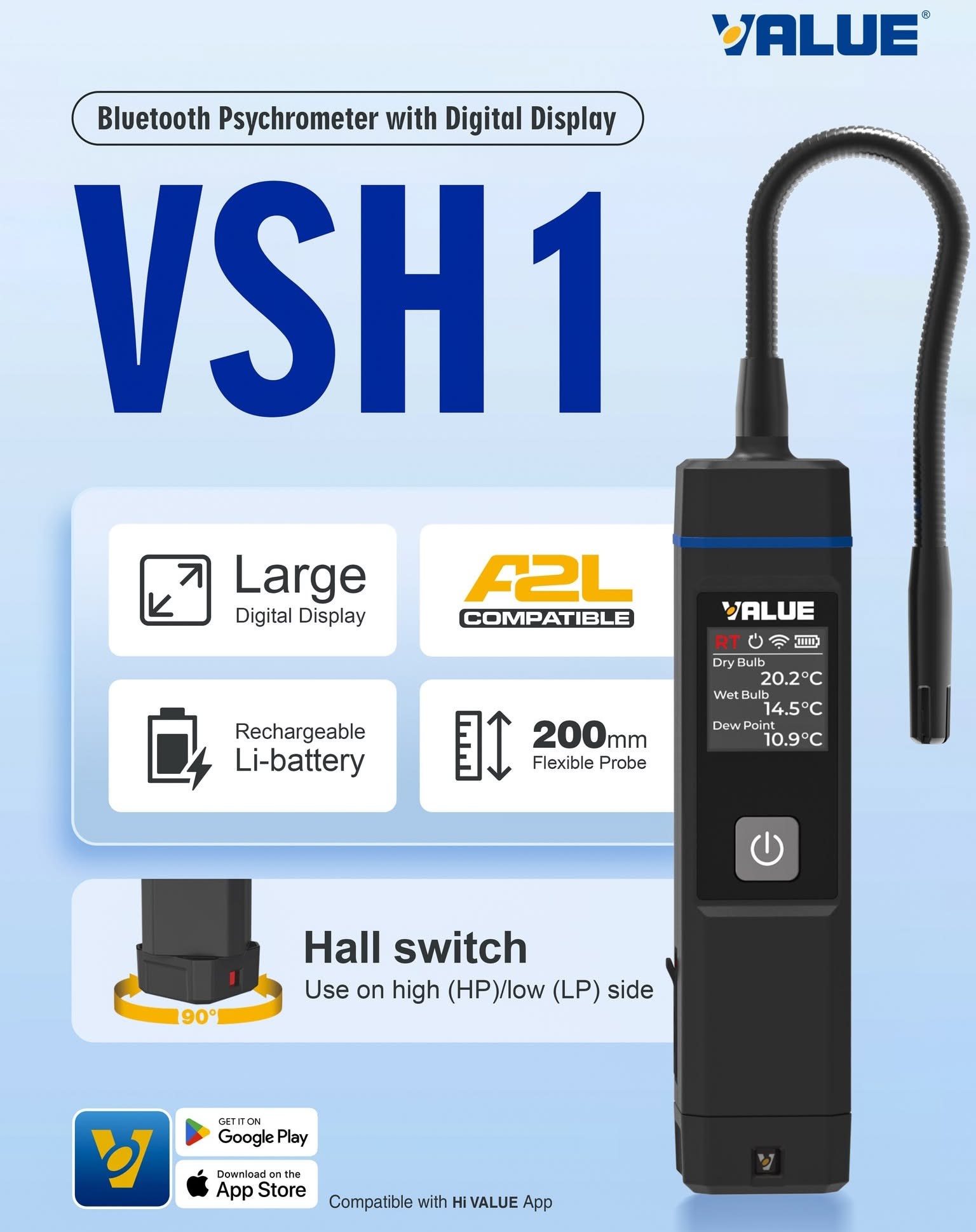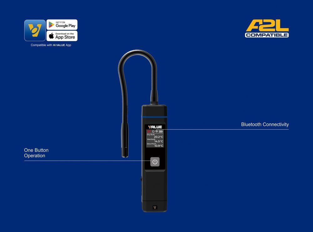 Le psychromètre TF-VSH1 avec affichage numérique se connecte via Bluetooth à l'application Hi VALUE pour une surveillance mobile en temps réel. Il est doté d'un grand écran numérique pour une lecture intuitive des données. Conçu pour supporter des températures extrêmes (-40 °C à 121 °C), il garantit une précision de qualité laboratoire avec une marge d'erreur de 0,1 % HR/0,1 °C, tandis que sa sonde flexible de 200 mm permet d'atteindre sans effort les endroits difficiles d'accès. Une batterie lithium rechargeable offre 40 heures d'utilisation continue via un chargement USB-C, et il est même compatible A2L. TF-VSH1 est équipé d'un commutateur spécifique pour faciliter le passage du mode Haute Pression au mode Basse Pression.