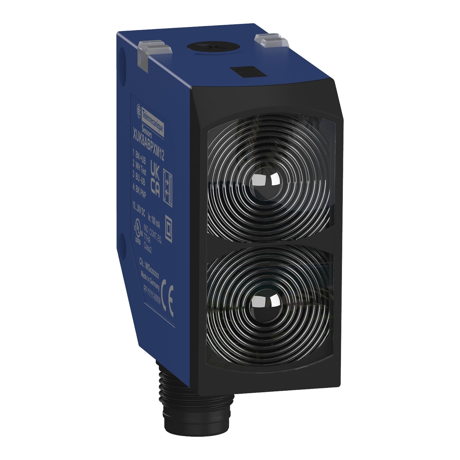 Telemecanique Sensors - XU - Capteur photoélectrique XUK8, BGS, lumière bleue, Sn 1200mm, PNP, connecteur M12, Alimentation 12V to 24V DC, Degré de protection IP67 and IP69K. EcoLab certifiée