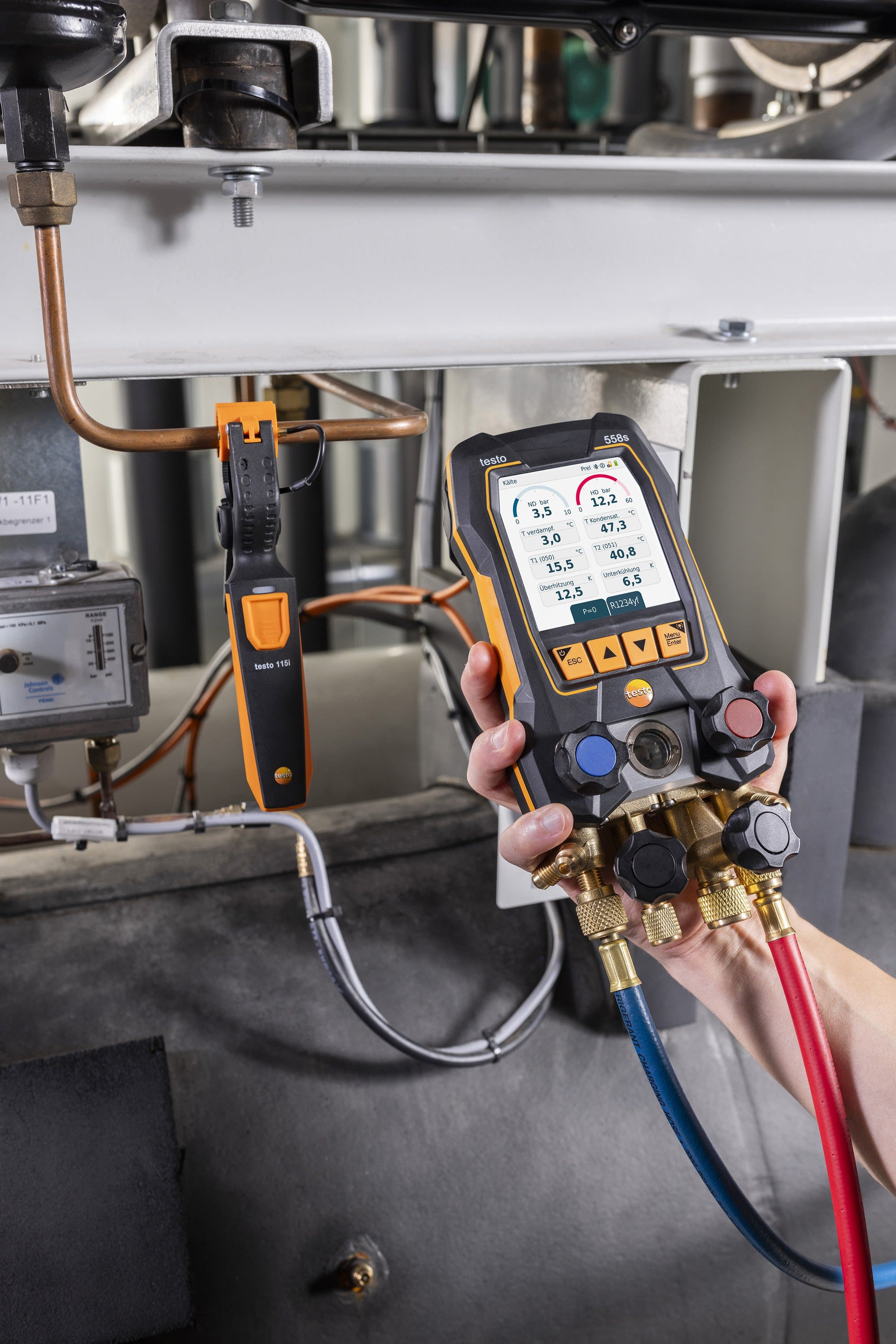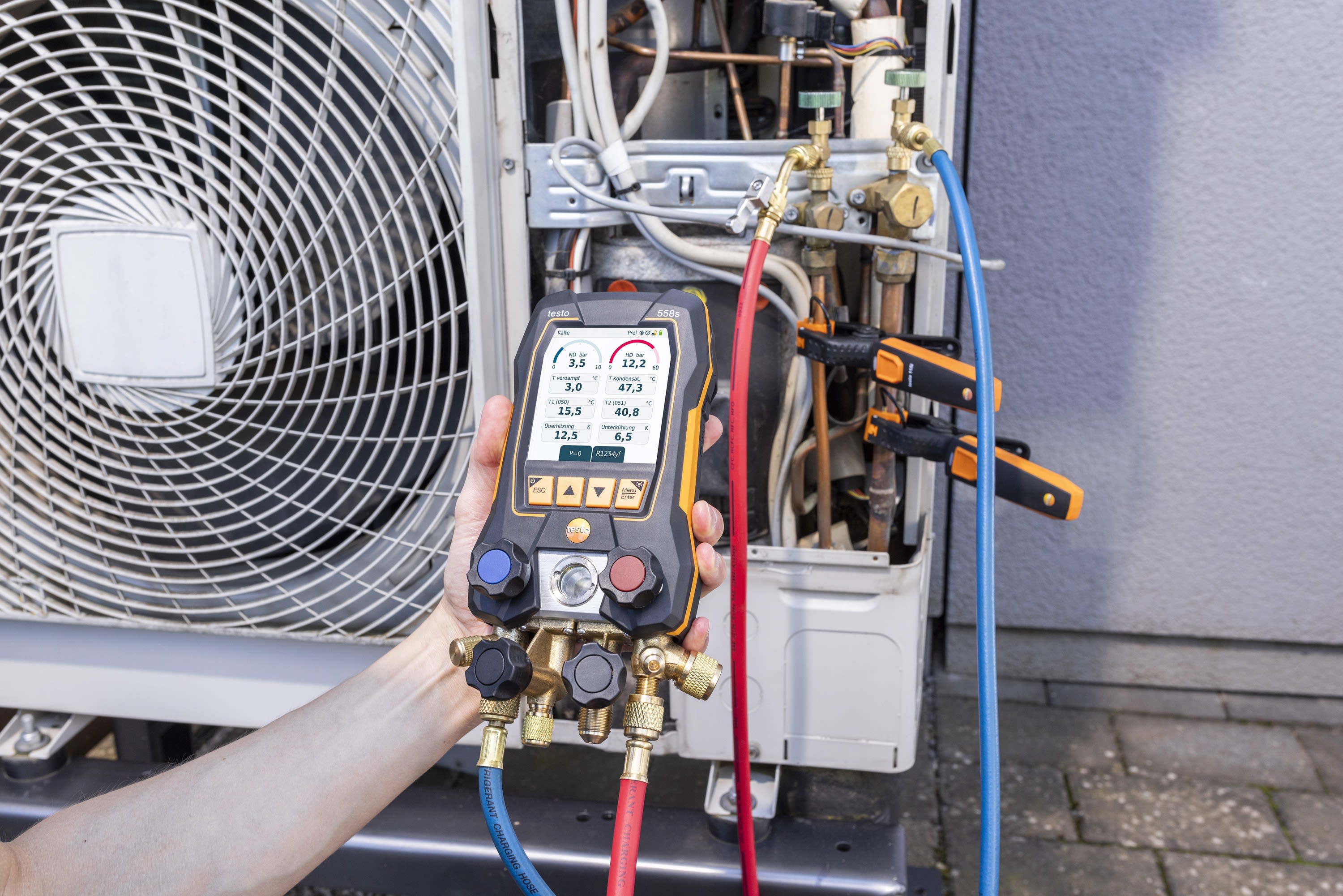 Bluetooth 150 m, A2L/A3, IP54 et courbes 30 min, pilotage via app Testo Smart ou écran.