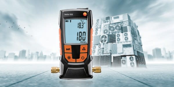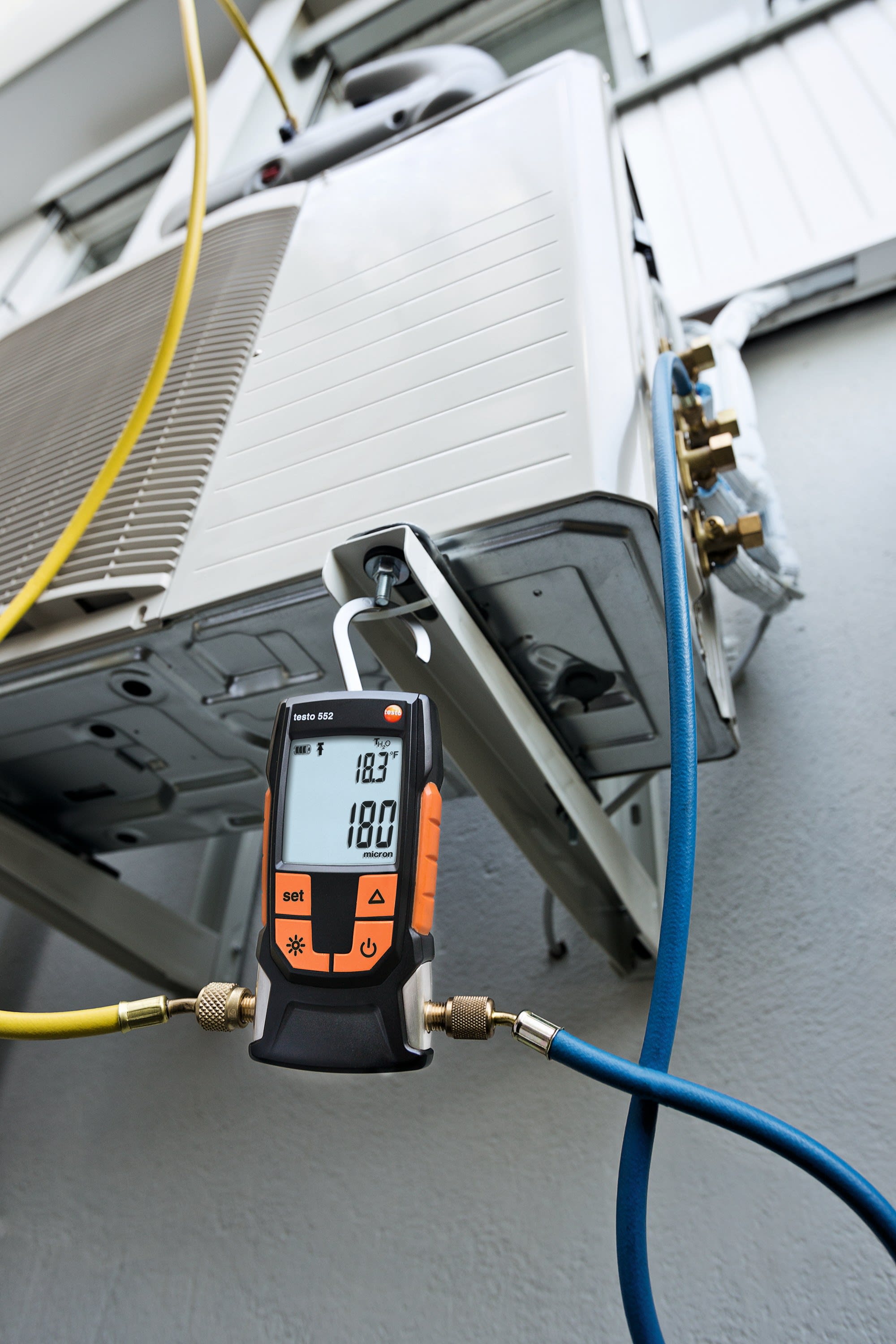 Extrêmement précis, fiable et robuste : le vacuomètre digital testo 552 avev Bluetooth convient parfaitement pour l'évacuation des installations frigorifiques et pompes à chaleur.