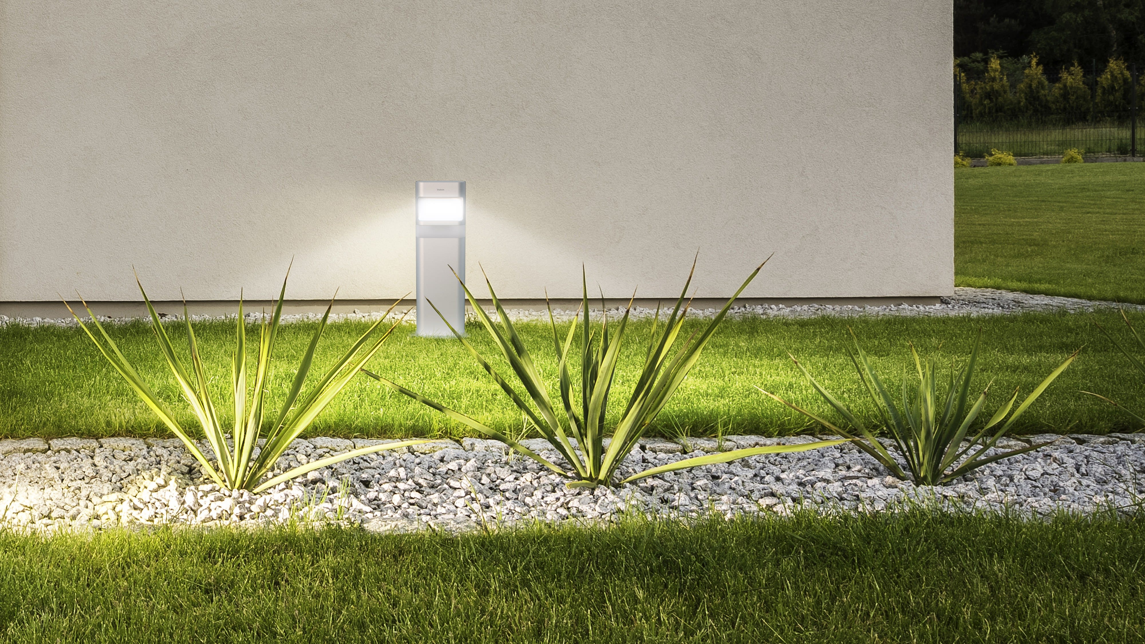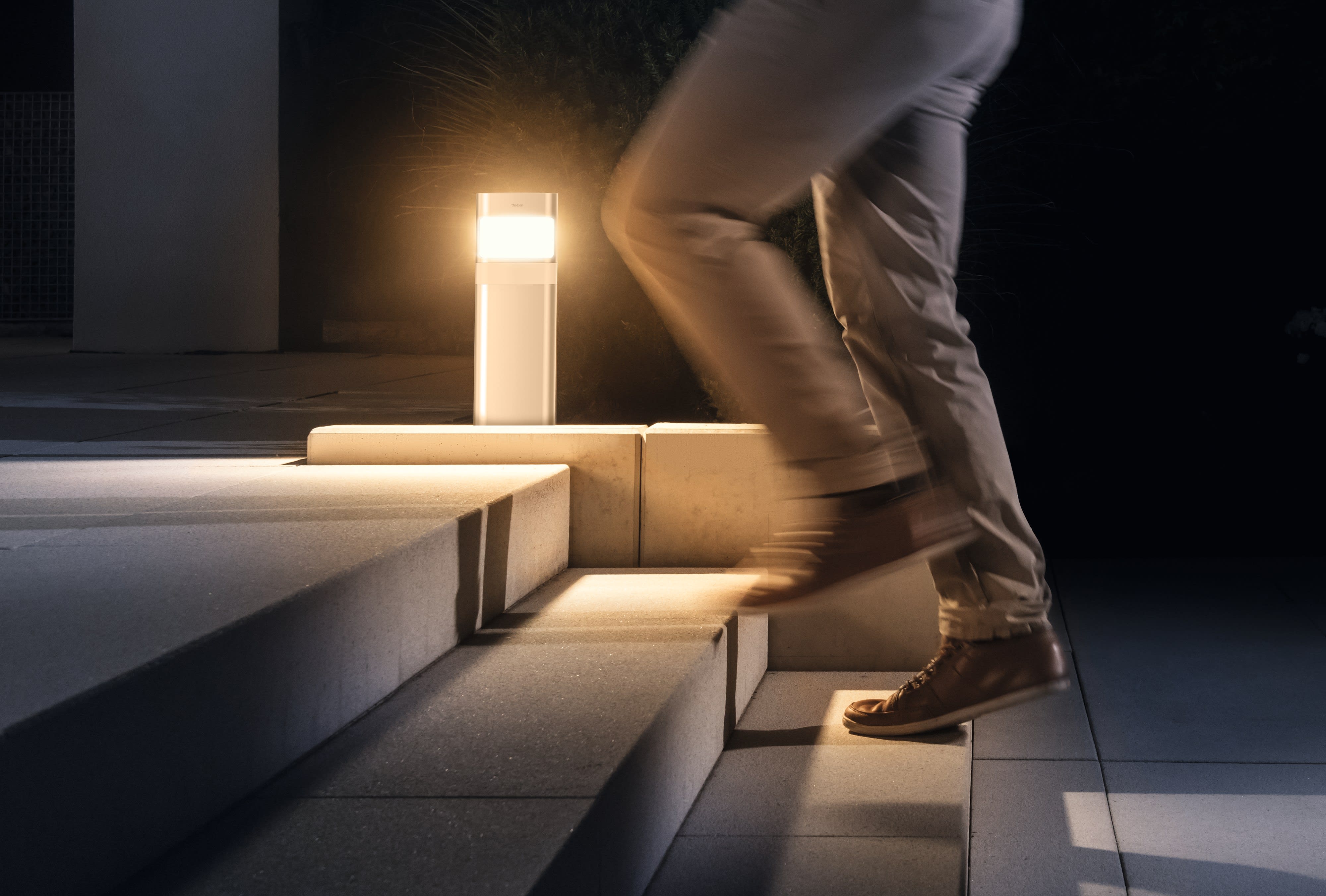 Borne à LED 40 cm de 8,5 W avec détecteur de mouvement. Sortie lumineuse frontale. IP55 pour usage extérieur. Angle de détection de 180° pour une portée 12 m. . Réglable par télécommande ou par potentiomètre. Interconnectivité par système radio