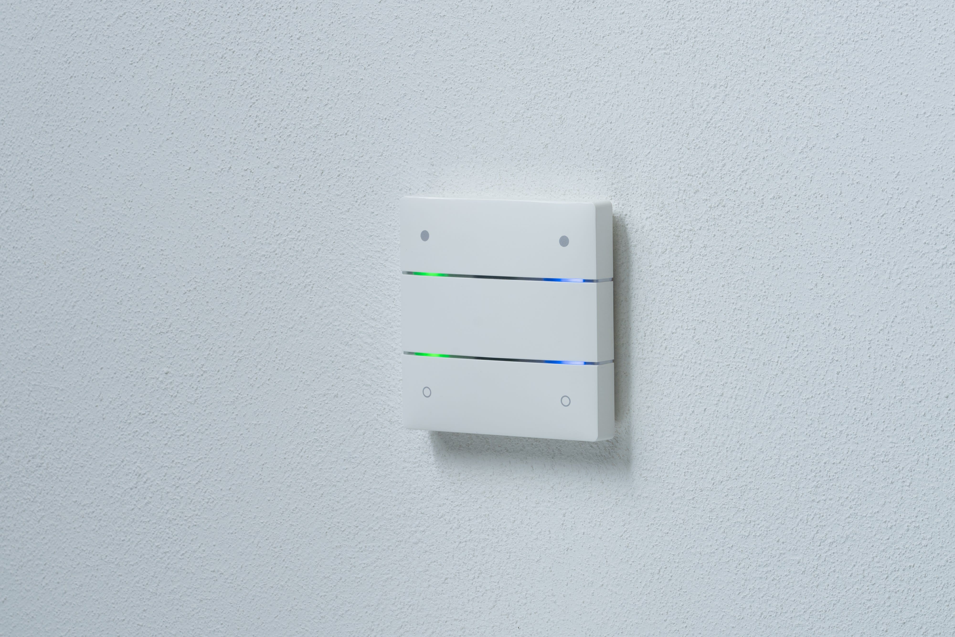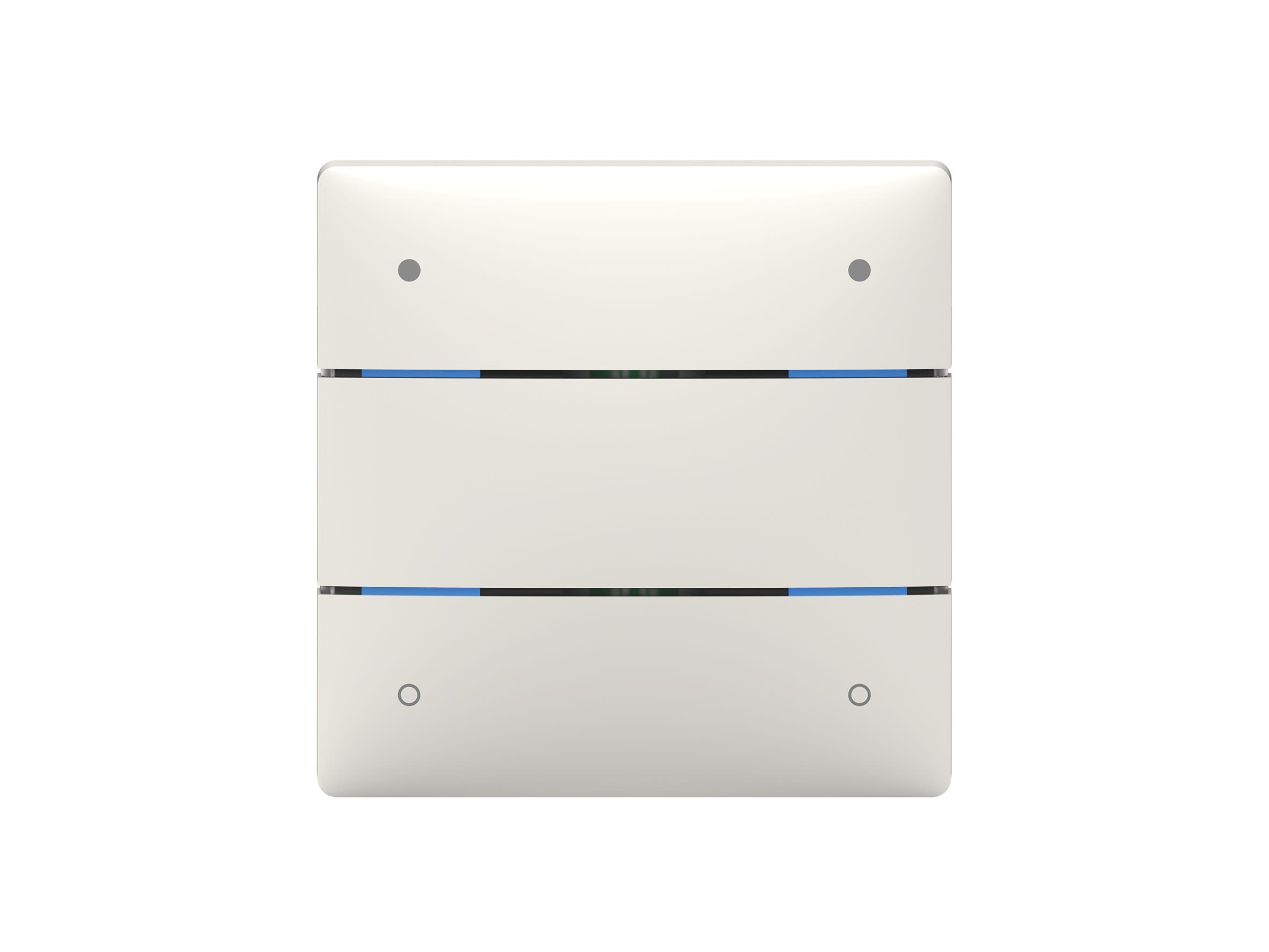Bouton poussoir 4 touches + LED d'état, sonde température intégrée. KNX Data Secure. Fonctions commutation, variation, store, scène, régulation de la température. Envoi de télégrammes différents grâce à un clic court, un clic long ou un double-clic.