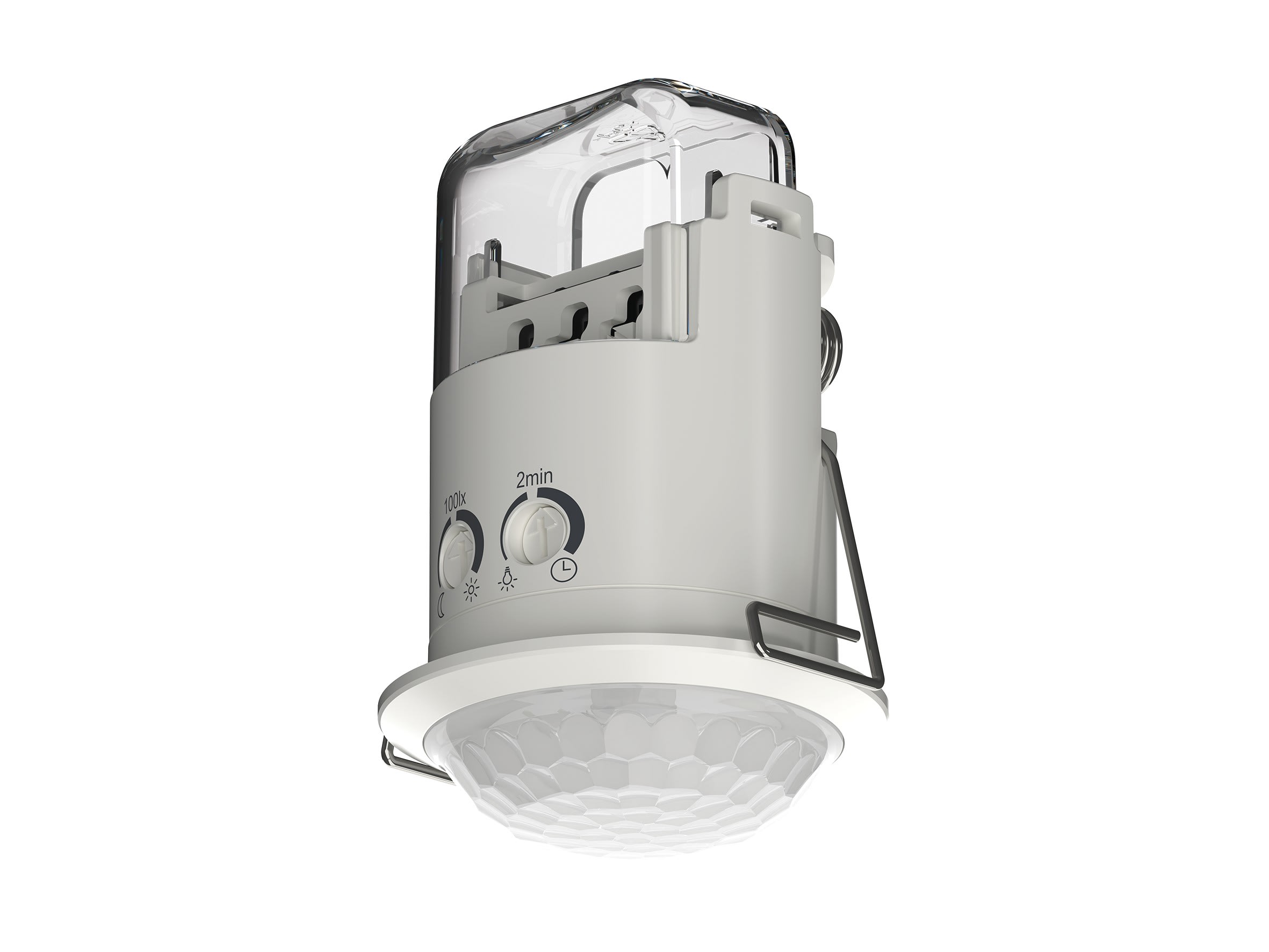 Détecteur de mouvement 360° pour montage plafond avec ressort. Zone de détection Ø 6 m à 2.5 m. Alimentation 230V. IP 21. Tempo 5s - 15 min. Ø perçage 40 mm.Possible connexion en parallèle pour étendre la zone de détection. 1 C 10A. LED = max 200W