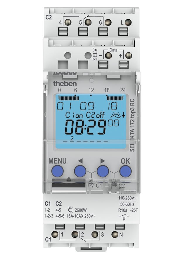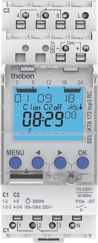 Horloge astronomique 2 canaux7 jrs. Prog par appli, PC ou directement sur l’horloge. 3 plages crépusculaires différentes. Réglage via la sélection d’une ville ou les coordonnées géographiques. Code PIN activable. Réserve de mémoire de 10 ans