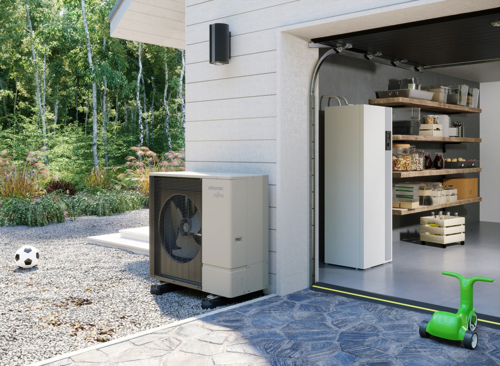 Montage en relève de chaudière pour PAC Duo, composé d'une vanne directionnelle motorisée, de tuyauteries, d'une sonde de départ, connecteurs