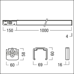 Alim. électr. de sortie flexible, blanc pour le raccordement électrique du chemin lumineux avec des bornes volantes pour 5 câbles d'alimentation, 2 x 2 lignes d’éclairage de sécurité et 2 lignes de commande. Rail porteur protégé contre la corrosion, en tôle d'acier profilé, galvanisé à chaud et avec revêtement en zinc-magnésium et laque de résine polyester, en blanc. La livraison comprend 11 tubes de protection et un manchon en polypropylène et TPE pour l’étanchéification de la zone de jonction entre deux rails porteurs. Découpe à la longueur flexible possible sur place. Dimensions : 1004 x 60 x 58 mm ; poids : 2 kg