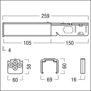 Alim. électrique de sortie, argent pour la connexion électrique du chemin lumineux. Borniers enfichables permettant le branchement de 5 câbles d’alimentation, de 2 x 2 lignes d’éclairage de sécurité et de 2 lignes de commande. Rail porteur protégé contre la corrosion, en tôle d'acier profilé, galvanisé à chaud et avec revêtement en zinc-magnésium et laque de résine polyester, en argent. La livraison comprend 11 tubes de protection et un manchon en polypropylène et TPE pour l’étanchéification de la zone de jonction entre deux rails porteurs. Dimensions : 109 x 60 x 58 mm ; poids : 0,6 kg