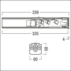 Alim. électrique d’entrée, argent pour la connexion électrique du chemin lumineux. Borniers enfichables permettant le branchement de 5 câbles d’alimentation, de 2 x 2 lignes d’éclairage de sécurité et de 2 lignes de commande. Rail porteur protégé contre la corrosion, en tôle d'acier profilé, galvanisé à chaud et avec revêtement en zinc-magnésium et laque de résine polyester, en argent. La livraison comprend 11 tubes de protection, 2 jeux d'embouts de fermeture (embouts + couvre-joints) et 2 protections contre les contacts pour la terminaison du profilé conducteur d’électricité à l'extrémité du chemin lumineux. Les embouts de rail porteur permettent le passage frontal des câbles grâce à quatre membranes push-out en TPE. Le système de chemin lumineux complet répond au degré de protection IP64 si la configuration est limitée aux composants suivants (système central) : éléments de fixation, rails porteurs, modules entrée/sortie, couvre-joints, réglettes pour chemins lumineux TECTON C, luminaires industriels CRAFT II. Le système de chemin lumineux complet répond au degré de protection IP54 lorsque la configuration comprend un ou plusieurs des composants suivants (système étendu) : luminaires de sécurité RESCLITE PRO, luminaires à pictogrammes CROSSIGN, capteurs, unités de contrôle sans fil. Dimensions : 339 x 60 x 58 mm ; poids : 0,78 kg