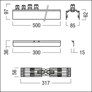 Kit d'alimentation médiane pour le raccordement électrique central ou la répartition des charges au centre du chemin lumineux TRINOS blanc. Sont compris dans la livraison standard : le rail porteur, les jonctions mécaniques, deux kits pour le raccordement électrique du chemin lumineux avec borniers enfichables pour 5 lignes secteur de 2,5mm², 2 lignes de commande de 2,5mm² et 2x2 lignes d'éclairage de secours de 1,5mm², des passe-câble à vis avec filet rallongé pour entrée de câble étanche. poids : 1,31 kg