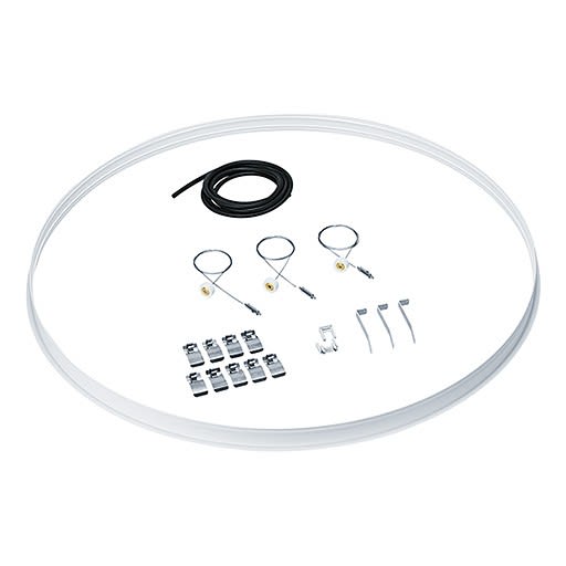 Kit d'encastrement pour ONDARIA LED rond avec diamètre de 1150 mm. Accessoires composés d'un cadre d'encastrement pour l'étanchéité de la découpe du plafond (diamètre de l'évidement au plafond : 1175 mm), suspension par câbles pour le montage sur le plafond brut, joint d'étanchéité pour faire un joint d'ombre net. Accessoires de démontage. Poids : 2,24 kg