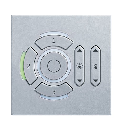Boîtier de commande carré, argent avec des touches disposées en cercle pour appeler trois ambiances d'éclairage. L'ambiance activée est indiquée par une diode lumineuse verte. Lorsque l'ambiance « arrêt » est activée, la touche Marche/Arrêt est entourée d'une lumière rouge. Pour intervenir dans l'ambiance activée, il existe deux touches basculantes permettant de graduer la luminosité de deux groupes de luminaires. Le corps et les touches du gros boîtier de commande de la taille d'un 87 x 87 x 13 mm sont en plastique Argent, avec une surface peinte satinée matte. Toutes les touches portent des pictogrammes intuitifs. Montage dans une boite d'encastrement simple au standard européen ou au standard BS métallique (non fournie). Les vis ne sont pas visibles après le montage.Le boîtier de commande est raccordé à la ligne de commande (à polarité interchangeable) DALI par des borniers à vis enfichables. Alimentation par ligne de commande DALI (pas de raccordement au secteur). Poids : 0,2 kg