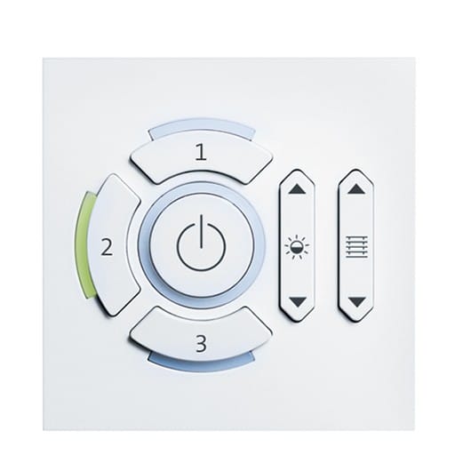 Circle Boîtier de commande carré, blanc avec touches placées en cercle permettant d'appeler trois scénarios au sein d’une pièce (appelés aussi ambiances). L'ambiance active est signalée par une diode électroluminescente verte. La touche centrale Entrée/Sortie est actionnée en entrant ou en quittant la pièce. Si l'ambiance « Sortie » est activée (utilisateur absent), la touche Entrée/Sortie est repérée par un voyant rouge circulaire. L'utilisateur dispose en outre de deux touches à bascule pour équipements permettant d’intervenir au niveau de l’ambiance active et de régler ainsi deux équipements dans la pièce.Le boîtier et les touches sont en Matière plastique blanc d'aspect satiné. Toutes les touches sont pourvues de pictogrammes intuitifs.Le montage s'effectue dans une simple prise Euro standard ou dans un boîtier « UK-metal-backbox » (non fourni à la livraison), les vis de fixation sont invisibles après montage.Le module de commande se raccorde à la ligne de commande DALI (à polarité interchangeable) par bornes à vis.L'alimentation se fait uniquement à partir de la ligne de commande DALI (aucune connexion au secteur) avec une consommation de courant de 6 mA (3 charges DALI.Dimensions : 87 x 87 x 13 mm, poids : 0,15 kg.