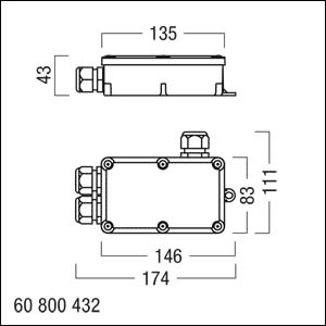 Boîtier universel MINI ; degré de protection IP67 ; permet le raccordement de max. 3 câbles d'alimentation appropriés (H07RNF, etc.) ; sert au câblage traversant de câbles d'alimentation secteur à l'extérieur du corps du luminaire ; entrée de câbles par 3 passe-câbles PG SW25 pour câbles de Ø 4,3-11,9 mm ; bornier à 4 pôles pour câbles de max. 2,5 mm² ; Dimensions : 174 x 111 x 43 mm