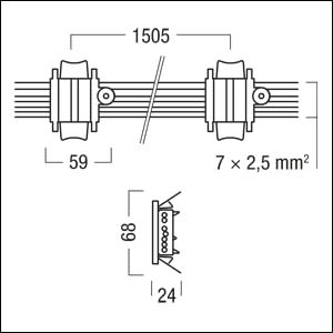 Câblage traversant pour chemin lumineux (PP3) en rouleau,(5 x lignes d'alimentation, 2 x lignes de commande), longueur = 45 m. Écart entre borniers 1500 mm. Sont fournis : 2 support de fil par bornier. Fixation par la technique d'encliquetage. poids : 9,54 kg.
