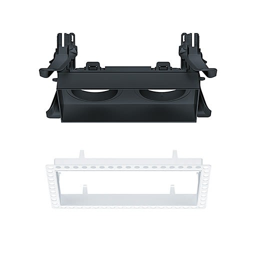 Cadre d´installation (double) avec cadre d'encastrement (trimless) pour plafonds en plâtre ; le cadre permet le remplissage d'enduit en plâtre et la finition in situ des joints de montage ; sert de plateforme pour la combinaison flexible des modules d'éclairage à LED DIAMO MD ; le cadre permet au module d'éclairage encastré d'être orientable sur 180° dans le plan horizontal et de 2 x 20° (SP/FL/VFL) dans le plan vertical ; montage simple sans outil du module par système d'encliquetage ; cadre en Polycarbonate (PC), ; montage sans outil par clips de fixation pour plafonds de 1-25 mm d'épaisseur ; découpe du plafond :202x107 mm, profondeur d'encastrement du module d'éclairage d'accentuation à LED : 150 mm ; dimensions extérieures du cadre : 222x127x79 mm ;poids : 0,22 kg;Note : le module d'éclairage à LED DIAMO MD doit être commandé séparément !