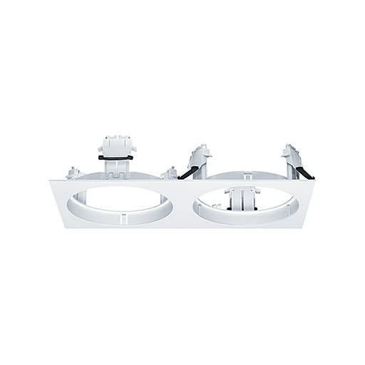 Cadre d'encastrement (double) sert de plateforme pour la combinaison flexible de deux modules d'éclairage d'accentuation à LED CARDAN evolution M ; montage simple sans outil du module par système d'encliquetage ; anneau en Polycarbonate (PC), renforcé aux fibres de verreblanc ; montage sans outil par clips de fixation antiglisse pour plafonds de 1-25 mm d'épaisseur ; découpe du plafond : 2xØ145, profondeur d'encastrement des modules d'éclairage d'accentuation à LED 170 mm ; dimensions de l'anneau : Øx68 mm ; poids : 0,19 kg;Note : démontage simple, intuitif des modules avec l'outil (60800854) à commander séparément !