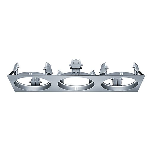 Cadre d'encastrement (triple) sert de plateforme pour la combinaison flexible de trois d'éclairage d'accentuation à LED CARDAN evolution M ; montage simple sans outil du module par système d'encliquetage ; anneau en Polycarbonate (PC), renforcé aux fibres de verreargenté mat ; montage sans outil par clips de fixation antiglisse pour plafonds de 1-25 mm d'épaisseur ; découpe du plafond : 3x Ø145, profondeur d'encastrement du module d'éclairage d'accentuation à LED : 170 mm ; dimensions de l'anneau : Øx68 mm ; poids : 0,28 kg;Note : démontage simple, intuitif des modules avec l'outil (60800854) à commander séparément !