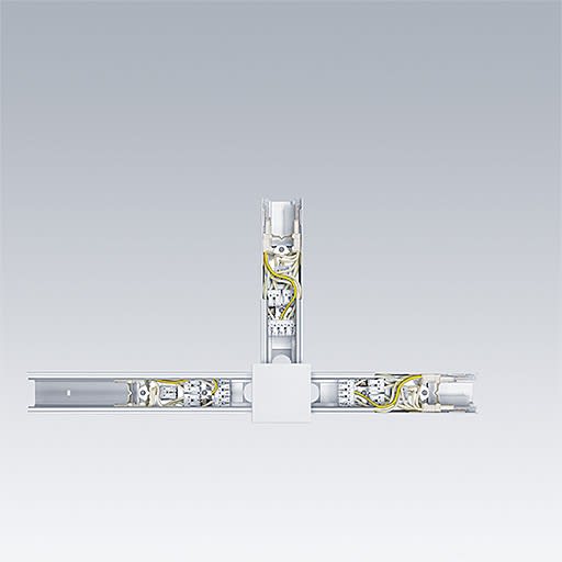 Connecteur électrique et mécanique de forme T, blanc. Avec un embout femelle et deux embouts mâles pour un raccord mécanique et 3 groupes de bornier pour entrée ou sortie électrique. Poids : 2,42 kg