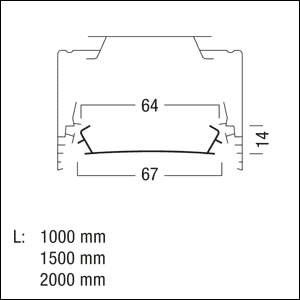 Cache de = 2000 mm pour un aspect homogène des chemins lumineux interrompus de couleur argent en matière plastique. Dimensions : 2000 x 67 x 14 mm. Poids : 0,27 kg.