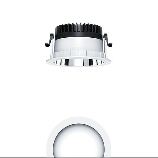 Plafonnier encastré à LED R150 (luminaire complet), avec Distribution lumineuse symétrique et extensive de la lumière (69 °), une efficacité maximale du luminaire, une technique d'éclairage downlight optimale ; une grande durabilité en raison d'une structure modulaire maximale continue et de composants échangeables. Module LED interchangeable, Distribution lumineuse symétrique et extensive de la lumière, Rendu des couleurs Ra > 90 (R9 > 50), température de couleur 4000 K ; Tolérance de la couleur (MacAdam intial): 2 ; Puissance du luminaire: 8,1 W ; Flux lumineux du luminaire: 1090 lm ; ; Efficacité lumineuse du luminaire: 135 lm/W ; Durée de vie utile médiane: L80 100000 h à 25 °C + L90 50000 h à 25 °C, avec convertisseur LED enfichable séparé, Luminaire commutable on/off ; ; unité réflecteur haut de gamme se fixant sur la chambre lumineuse modulaire à LED grâce à la fermeture à baïonnette ; chambre lumineuse à LED extrêmement efficace intégrée dans la gestion thermique passive optimisée en Gestion thermique passive en polycarbonate thermoconducteur de grande qualité, réflecteur/collerette en Polycarbonate (PC) de grande qualité et résistant aux UV ; réflecteur : aluminisé, haut brillant, sans irisation ; ; collerette : blanc ; collerette d’encastrement en Polycarbonate (PC) ; blanc ; degré de protection : IP54_IP20 ; ; câblage du luminaire sans halogène ; raccordement : Bornier tripolaire à enfichage ; Câblage en dérivation possible ; ; tension secteur : 220-240 V / 0/50/60 Hz, compatible avec une batterie centralisée à courant continu de 220-240 V DC ; ; Montage rapide sans outil à l'aide de clips de fixation anti-dérapants pour épaisseurs de plafond de 1 à 40 mm (selon les modèles de luminaires) grâce à des barrettes de maintien interchangeables ; montage rapide sans outil de l'unité d'éclairage à l’aide d'une fermeture à baïonnette, découpe de plafond : 150 mm , profondeur d'encastrement : 100 mm; poids : 0,54 kg ; ;Pour des applications dans les bureaux conformément à la norme EN12464 avec UGR 19 (réflecteur alumisé)