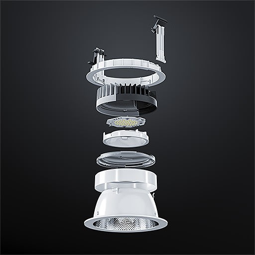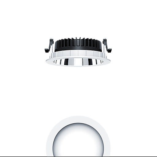 Plafonnier encastré à LED R150 (luminaire complet), avec Distribution lumineuse symétrique et extensive de la lumière (80 °), une efficacité maximale du luminaire, une technique d'éclairage downlight optimale ; une grande durabilité en raison d'une structure modulaire maximale continue et de composants échangeables. Module LED interchangeable, Distribution lumineuse symétrique et extensive de la lumière, Rendu des couleurs Ra > 90 (R9 > 50), température de couleur 4000 K ; Tolérance de la couleur (MacAdam intial): 2 ; Puissance du luminaire: 14 W ; Flux lumineux du luminaire: 2040 lm ; ; Efficacité lumineuse du luminaire: 146 lm/W ; Durée de vie utile médiane: L80 100000 h à 25 °C + L90 50000 h à 25 °C, avec convertisseur LED enfichable séparé, Luminaire commutable on/off ; ; unité réflecteur haut de gamme se fixant sur la chambre lumineuse modulaire à LED grâce à la fermeture à baïonnette ; chambre lumineuse à LED extrêmement efficace intégrée dans la gestion thermique passive optimisée en Gestion thermique passive en polycarbonate thermoconducteur de grande qualité, réflecteur/collerette en Polycarbonate (PC) de grande qualité et résistant aux UV ; réflecteur : aluminisé, haut brillant, sans irisation ; ; collerette : blanc ; collerette d’encastrement en Polycarbonate (PC) ; blanc ; degré de protection : IP54_IP20 ; ; câblage du luminaire sans halogène ; raccordement : Bornier tripolaire à enfichage ; Câblage en dérivation possible ; ; tension secteur : 220-240 V / 0/50/60 Hz, compatible avec une batterie centralisée à courant continu de 220-240 V DC ; ; Montage rapide sans outil à l'aide de clips de fixation anti-dérapants pour épaisseurs de plafond de 1 à 25 mm (selon les modèles de luminaires) grâce à des barrettes de maintien interchangeables ; montage rapide sans outil de l'unité d'éclairage à l’aide d'une fermeture à baïonnette, découpe de plafond : 150 mm , profondeur d'encastrement : 70 mm; poids : 0,48 kg ; ;Faible profondeur d'encastrement lors d’une utilisation dans un espace réduit dans le plafond.