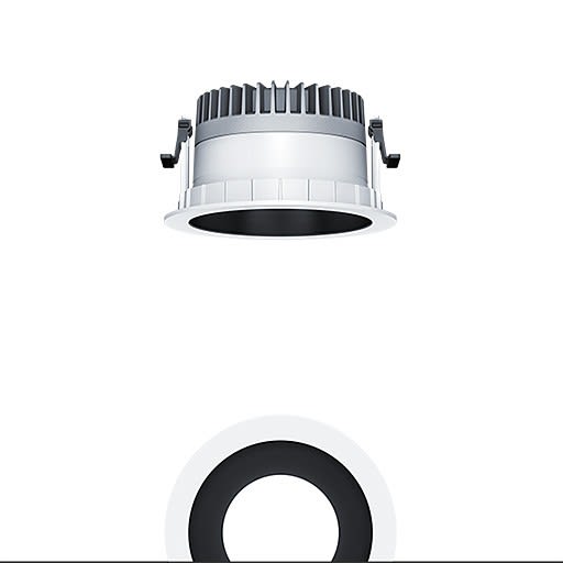 Plafonnier encastré à LED R150 (luminaire complet), avec Distribution lumineuse symétrique et extensive de la lumière (66 °), une efficacité maximale du luminaire, une technique d'éclairage downlight optimale ; une grande durabilité en raison d'une structure modulaire maximale continue et de composants échangeables. Module LED interchangeable, Distribution lumineuse symétrique et extensive de la lumière, Rendu des couleurs Ra > 80, température de couleur 4000 K ; Tolérance de la couleur (MacAdam intial): 2 ; Puissance du luminaire: 21,9 W ; Flux lumineux du luminaire: 1820 lm ; ; Efficacité lumineuse du luminaire: 83 lm/W ; Durée de vie utile médiane: L80 100000 h à 25 °C + L90 50000 h à 25 °C, avec convertisseur LED enfichable séparé, Luminaire commutable on/off ; ; unité réflecteur haut de gamme se fixant sur la chambre lumineuse modulaire à LED grâce à la fermeture à baïonnette ; chambre lumineuse à LED extrêmement efficace intégrée dans la gestion thermique passive optimisée en Gestion thermique passive en aluminium recyclé injecté sous pression, réflecteur/collerette en Polycarbonate (PC) de grande qualité et résistant aux UV ; réflecteur : laqué noir ; ; collerette : blanc ; collerette d’encastrement en Polycarbonate (PC) ; blanc ; degré de protection : IP54_IP20 ; ; câblage du luminaire sans halogène ; raccordement : Bornier tripolaire à enfichage ; Câblage en dérivation possible ; ; tension secteur : 220-240 V / 0/50/60 Hz, compatible avec une batterie centralisée à courant continu de 220-240 V DC ; ; Montage rapide sans outil à l'aide de clips de fixation anti-dérapants pour épaisseurs de plafond de 1 à 40 mm (selon les modèles de luminaires) grâce à des barrettes de maintien interchangeables ; montage rapide sans outil de l'unité d'éclairage à l’aide d'une fermeture à baïonnette, découpe de plafond : 150 mm , profondeur d'encastrement : 100 mm; poids : 0,71 kg ; ;Pour des applications dans les bureaux conformément à la norme EN12464 avec UGR 19 (réflecteur alumisé)