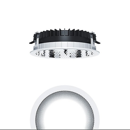 Plafonnier encastré à LED R200 (luminaire complet), avec Distribution lumineuse symétrique et extensive de la lumière (83 °), une efficacité maximale du luminaire, une technique d'éclairage downlight optimale ; une grande durabilité en raison d'une structure modulaire maximale continue et de composants échangeables. Module LED interchangeable, Distribution lumineuse symétrique et extensive de la lumière, Rendu des couleurs Ra > 90 (R9 > 50), température de couleur 3000 K ; Tolérance de la couleur (MacAdam intial): 2 ; Puissance du luminaire: 13,9 W ; Flux lumineux du luminaire: 2020 lm ; ; Efficacité lumineuse du luminaire: 145 lm/W ; Durée de vie utile médiane: L80 100000 h à 25 °C + L90 50000 h à 25 °C, avec convertisseur LED enfichable séparé, Luminaire pilotable via DALI (via DALI uniquement) ; avec fonction DC, réglable de 1 à 100 %, configurable NFC, compatible SwitchDIM ; unité réflecteur haut de gamme se fixant sur la chambre lumineuse modulaire à LED grâce à la fermeture à baïonnette ; chambre lumineuse à LED extrêmement efficace intégrée dans la gestion thermique passive optimisée en Gestion thermique passive en polycarbonate thermoconducteur de grande qualité, réflecteur/collerette en Polycarbonate (PC) de grande qualité et résistant aux UV ; réflecteur : à facettes, aluminisé, grand brillant, sans irisation ; ; collerette : blanc ; collerette d’encastrement en Polycarbonate (PC) ; blanc ; degré de protection : IP54_IP20 ; ; câblage du luminaire sans halogène ; raccordement : Bornier à 5 pôles à enfichage ; Câblage en dérivation possible ; ; tension secteur : 220-240 V / 0/50/60 Hz, compatible avec une batterie centralisée à courant continu de 220-240 V DC ; ; Montage rapide sans outil à l'aide de clips de fixation anti-dérapants pour épaisseurs de plafond de 1 à 25 mm (selon les modèles de luminaires) grâce à des barrettes de maintien interchangeables ; montage rapide sans outil de l'unité d'éclairage à l’aide d'une fermeture à baïonnette, découpe de plafond : 200 mm , profondeur d'encastrement : 75 mm; poids : 0,68 kg ; ;Faible profondeur d'encastrement lors d’une utilisation dans un espace réduit dans le plafond.