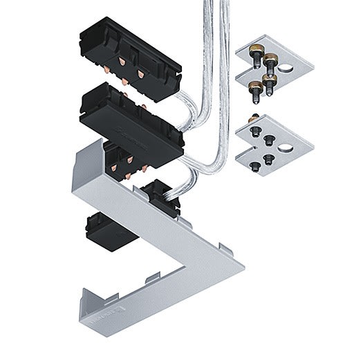 Jonction d´angle à 90° (électrique) avec alimentation ; pour le raccordement mécanique et électrique en angle (90°) ; composé de deux rails conducteurs TBT (profilés en H) de chacun 1000 mm, d'un connecteur, d'un câblage de liaison avec clips à contact, d'un câble d'alimentation (48 V) et d'un cache ; jonction en tôle d'acier, cache en Polycarbonate (PC) argent laqué ; 3 m de câble de raccordement ; poids : 2,45 kg