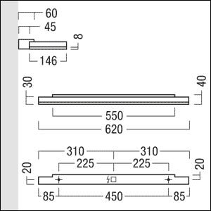 Applique à LED, écl. indirect/direct à LED avec optique monobloc MPO-plus à structure micropyramidale pour un aspect continu. Puissance du luminaire: 36,1 W, Luminaire pilotable via DALI (via DALI uniquement) avec convertisseur à LED ; durée de vie des LED 50000 h jusqu'à une diminution du flux lumineux à 80 % de la valeur initiale. Tolérance de la couleur (MacAdam intial): 3. Flux lumineux du luminaire: 4660 lm, Efficacité lumineuse du luminaire: 129 lm/W. Rendu des couleurs Ra > 80, température de couleur 4000 K.Distribution photométrique indirecte/directe (60/40). Guidage du flux basé sur la technique du guide de lumière LitePrint® à haute efficacité combiné à l'optique micropyramidale multicouche MPO+, aspect continu et sortie de flux définie pour une répartition sans éblouissement de la lumière avec UGR < 19 et L65 < 3000 cd/m² selon la norme EN 12464-1 ; luminance réduite dans les angles aigus pour le défilement spécial des écrans fortement inclinés et pour un maximum de souplesse dans l'agencement des luminaires ; résolution homogène des point lumineux à LED ; répartition asymétrique indirecte de l'éclairage. Vasque lisse à l'extérieur en polymétacrylate de méthyle extrapur pour un aspect brillant, peu salissant et facile à nettoyer. Corps du luminaire plat argent en aluminium anodisé argent avec hauteur visible du luminaire de 30 mm. Luminaire avec câble exempt d'halogène. Dimensions : 620 x 146 x 40 mm, poids : 4,5 kg