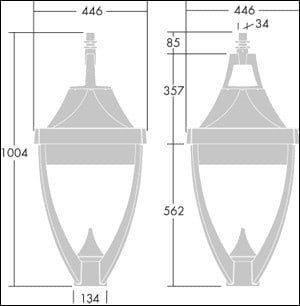 Lanterne LED patrimoine moderne Suspendu via 34G. avec optique fermée. Electronique,. Classe électrique II, IP65, IK08. Corps : aluminium injecté thermopoudré gris 900, finition texturé (close to RAL 7043). Boîtier : verre trempé. Livré avec LED 2 700 K. Dimensions : 446 x 446 x 1004 mm Puissance du luminaire: 55 W Poids : 16,5 kg Scx : 0.14 m²