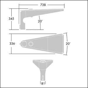 Lanterne d’éclairage urbain LED, Small avec 36 LED alimentées en 700mA et optique pour Large route. Electronique, non gradable. Classe électrique II, IP66, IK09. Corps : aluminium injecté, texturé gris foncé. Fermeture : verre transparent trempé plat. Pré-câblé avec 8 m de câble. Montage top sur mât de Ø 60mm. Système de réduction de puissance intégré avec un palier à 50 % de la puissance initiale, fonctionnant 3 heures avant et 5 heures après le point milieu de la nuit calculé. Livré avec LED 4 000 K.Dimensions : 738 x 336 x 345 mmPuissance du luminaire: 77 WPoids : 10,5 kgScx : 0.1 m²