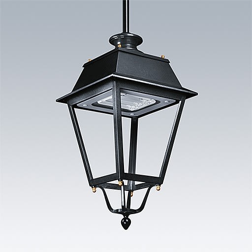 Lanterne suspension de style 19e siècle avec 24 LED alimentées en 500mA et optique pour Route étroite. Classe électrique II, IP66, IK08. Corps : Acier inox, laqué noir (similaire à RAL9005). Capot : GRP/polyester, finition noir (similaire à RAL9005). Fermeture : verre trempé épaisseur 5 mm. Livré avec LED 3 000 KDimensions : 420 x 420 x 944 mmPuissance du luminaire: 38 WPoids : 10,3 kgScx : 0.145 m²