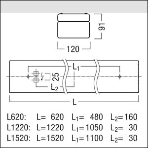 Luminaire apparent à LED IP50 à vasque opale. Puissance du luminaire: 18,1 W, Luminaire pilotable via DALI avec convertisseur à LED. Durée de vie des LED 100000 h jusqu'à une diminution du flux lumineux à 90 % de la valeur initiale. Tolérance de la couleur (MacAdam intial): 3. Flux lumineux du luminaire: 2000 lm, Efficacité lumineuse du luminaire: 110 lm/W. Rendu des couleurs Ra > 80, température de couleur 3000 K. Protection ESD intégrée dans le module à LED. Corps en tôle d'acier prélaqué et profilé, blanc, vasque moulée en Polyméhylméhacrylate opal avec Résistance aux impacts : IK03. Joint périphérique haut de gamme en mousse de polyuréthane hydrophobe ; montage par rondelles fendues et entretoise fournies. Température ambiante : -20°C à +25°C admissible. Luminaire à filerie exempte d'halogène. Note : en cas d'utilisation dans des atmosphères à à forte sollicitation chimique ou en extérieur, veuillez prendre contact avec votre conseiller. Dimensions : 620 x 120 x 91 mm ; poids : 2 kg.