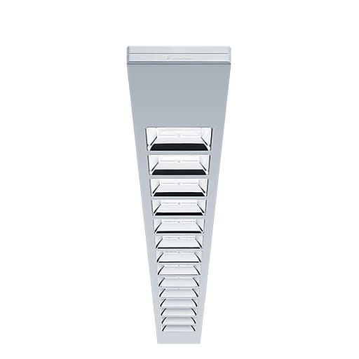Luminaire apparent à LED fin avec système de chambre lumineuse prismatique et driver LED intégré. LED Puissance du luminaire: 38,2 W, Luminaire pilotable via DALI (via DALI uniquement) avec convertisseur à LED. Durée de vie des LED 50000 h jusqu'à une diminution du flux lumineux à 90 % de la valeur initiale. Tolérance de la couleur (MacAdam intial): 3. Gesamtlichtstrom x LOR}, Efficacité lumineuse du luminaire: 141 lm/W. Rendu des couleurs Ra > 80, température de couleur 4000 K. Limitation de l’éblouissement suivant la norme EN 12464-1:2011 avec L65 < 3000 cd/m² pour 65° tout autour et UGR < 16 pour les postes de travail devant écran. Guidage de la lumière et contrôle de l’éblouissement de l’éclairage direct via un système de chambre lumineuse avec une surface de sortie prismatique de la lumière en argent, brillant. Système optique fermé avec protection contre les contacts accidentels des modules à LED empêchant une dégradation par décharge électrostatique. Corps de luminaire en profilé d'aluminium extrudé, thermopoudré argent d’une hauteur latérale visible de 27 mm, embouts en aluminium injecté sous pression de couleur argent.Cache arrière en tôle d’acier thermopoudrée en blanc. Luminaire avec câble exempt d'halogène. Dimensions : 2480 x 128 x 39 mm. Poids : 7,1 kg.