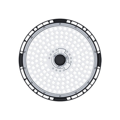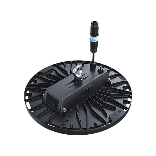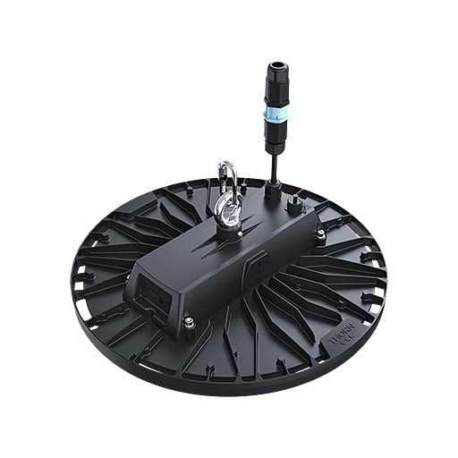 Luminaire à LED IP65 pour grandes hauteurs, avec une suspension à un point. Lentilles performantes offrant un contrôle de l'éblouissement et un angle de 90° à large faisceau pour un éclairage homogène. Afin de garantir des performances optimales dans les environnements industriels, la conception du boîtier permet un refroidissement par flux d'air du luminaire. Flux lumineux global: 30000 lm, Puissance du luminaire: 195 W, Efficacité lumineuse du luminaire: 154 lm/W , température de couleur (CCT) de 4000 K, durée de vie : 50 000 h @L80. Rendu des couleurs : IRC > 80, Tolérance de la couleur (MacAdam intial): 5. Livré avec un anneau et un mousqueton. Convertisseur à large plage de tensions 100 à 277 V AC 50/60 Hz. Protection contre la surtension jusqu'à 4 kV. Pré-câblé avec un câble d'alimentation (15 cm) et connecteur rapide. Accessoires disponibles : étrier, détecteur de mouvement à micro-ondes (MWS), capteur PIR et télécommande pour la mise en marche. Flux lumineux réglable sur site à 3 niveaux (FLEX1 : 30000 lm (195W), FLEX2 : 25000 lm (160W), FLEX3 : 20000 lm (130W). Pour plus d’informations sur le paramétrage de la puissance, veuillez vous rendre sur le site www.THORNeco.com. Dimensions : Ø380 x 130 mm, poids : 3,13 kg.