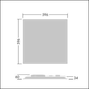 Luminaire LED encastré, carré. Driver Flux fixe. Classe électrique II, IP44_IP20, Résistance aux impacts : IK03. Corps : tôle d'acier, blanc (similaire à RAL9016). Diffuseur : PMMA opale avec film micro-prismatique. Livré avec filin de sécurité. Livré avec LED 3 000 K.UGR < 19 et L65 < 3000 cd/m² conforme à EN 12464Dimensions : 596 x 596 x 34 mmPuissance du luminaire: 33,6 WFlux lumineux du luminaire: 3690 lmEfficacité lumineuse du luminaire: 110 lm/WPoids : 2 kg