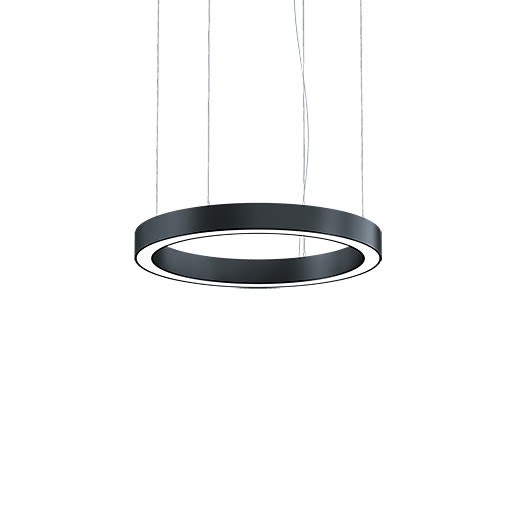 Luminaire suspendu à LED en forme d’anneau à éclairage direct/indirect, avec un boîtier profilé fin en aluminium, de couleur noir et avec une optique Technologie MicroPrisme. Puissance du luminaire: 64,2 W, Luminaire pilotable via DALI avec convertisseur à LED ; durée de vie des LED de 50000 h jusqu’à une diminution du flux lumineux de 90 % de la valeur initiale. Tolérance de la couleur (MacAdam intial): 3. Flux lumineux du luminaire: 6032 lm, Efficacité lumineuse du luminaire: 94 lm/W. Rendu des couleurs Ra > 90, température de couleur 3000 K. Guidage de la lumière par le biais d’une optique à structure micropyramidale multicouche pour une sortie définie du flux avec UGR < 19 et L < 3000 cd/m² à 65° pour les applications avec écra. Boîtier profilé en aluminium laminé et extrudé, soudure sans raccords, de couleur noir thermopoudré pour une finition de surface haut de gamme ; câbles de suspension et accessoires de montage fournis, cache-piton de plafond à commander séparément. Câblage du luminaire sans halogène. Longueur du câble de suspension : 3 m. Test du filament incandescent : 650°C ; Luminaire à filerie exempte d'halogène et sans silicone ; Dimensions : Ø800 x 85 mm, poids : 6 kg.