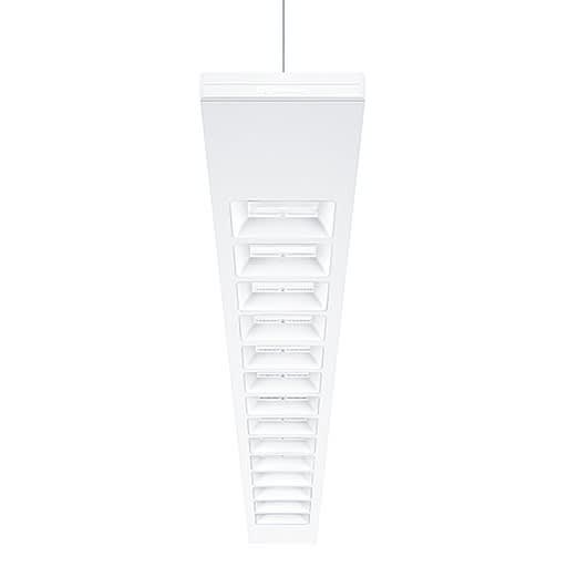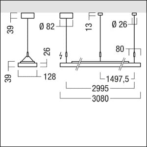 Luminaire suspendu à LED plat direct/indirect avec système de chambre lumineuse prismatique et driver LED intégré. Puissance du luminaire: 85 W à LED, Commande sans fil contrôlée par appli avec Bluetooth® 4.x - basicDIM Wireless avec convertisseur à LED. Durée de vie des LED 50000 h jusqu'à une diminution du flux lumineux à 90 % de la valeur initiale. Tolérance de la couleur (MacAdam intial): 3. Flux lumineux du luminaire: 13320 lm, Efficacité lumineuse du luminaire: 157 lm/W. Rendu des couleurs Ra > 80, température de couleur 3000 K. Limitation de l’éblouissement suivant la norme EN 12464-1:2011 avec L65 < 3000 cd/m² pour 65° tout autour et UGR < 16 pour les postes de travail devant écran. LED disposées sur platine guide optique double face. Guidage de la lumière et contrôle de l’éblouissement de la composante directe via un système de chambre lumineuse avec une sortie prismatique de la lumière en blanc, mat. Distribution lumineuse extensive de la composante indirecte via un profilé à lentilles extrudé, pour une résolution uniforme des points lumineux (à partir d'une hauteur de suspension de 30 cm) au plafond. Système optique fermé avec protection contre les contacts accidentels des modules à LED empêchant une dégradation par décharge électrostatique. Boîtier en profilé d'aluminium extrudé, thermopoudré blanc avec une hauteur latérale visible de 26 mm, embouts en aluminium moulé sous pression peints dans la couleur blanc du luminaire. Cache arrière en tôle d’acier thermopoudrée en blanc pour une efficacité maximale. Luminaire avec câble exempt d'halogène. Points de suspensions extérieurs, ajustage de +/- 2,3 cm et suspension centrée fixe. Montage du luminaire, à l’aide d’accessoires, également possible sous forme d’un chemin lumineux. Disposition des luminaires : commande mobile à max. 15 m du luminaire, distance entre luminaires 4 m (milieu). Définition radio: basicDIM Wireless - Bluetooth® 4.x Fréquence radio: 2,4...2,483 GHz Puissance d'émission radio: + 4dBm Kit d'alimentation et de suspension adapté au modèle L3080, à commander séparément. Dimensions : 3080 x 128 x 39 mm. Poids : 9,25 kg.