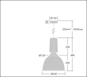 Suspension LED moderne et efficace. Convient pour les installations de secours avec batterie centrale Commande sans fil contrôlée par appli avec Bluetooth® 4.x - basicDIM Wireless Électronique,. Boîtier : aluminium fonderie avec finition noir satiné. Réflecteur : prismatique Polycarbonate (PC) avec fixation au boîtier de type baïonnette. Classe électrique I, IP20. Suspension par câble unique réglable 2,5m (fourni). Pré-câblé avec un câble tressé en silicone ignifuge, 5 P 0,75 mm². Livré avec LED 3 000 KDéfinition radio: basicDIM Wireless - Bluetooth® 4.x, Fréquence radio: 2,4...2,483 GHz, Puissance d'émission radio: + 4dBm.Dimensions : Ø340/140 x 485 mmPuissance du luminaire: 72 WPoids : 5 kg